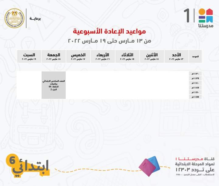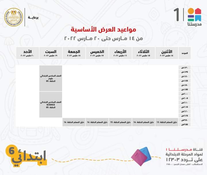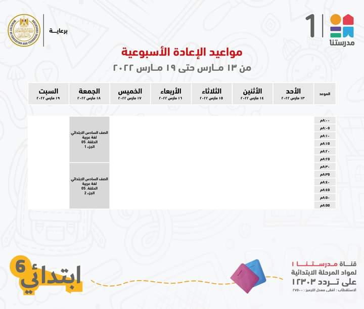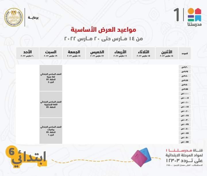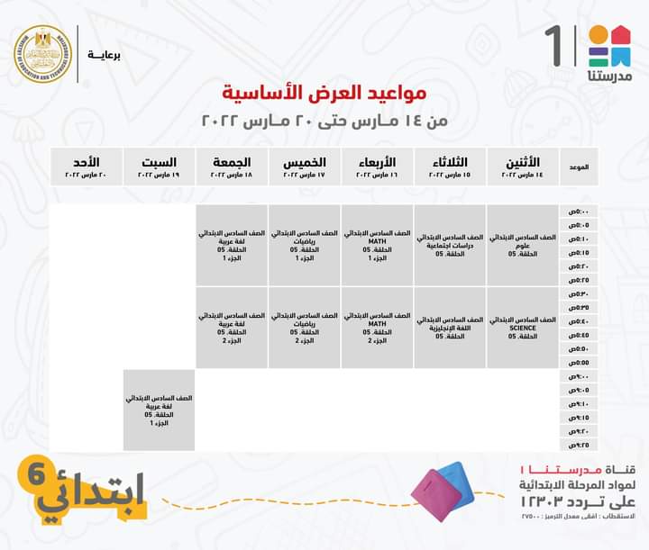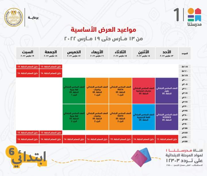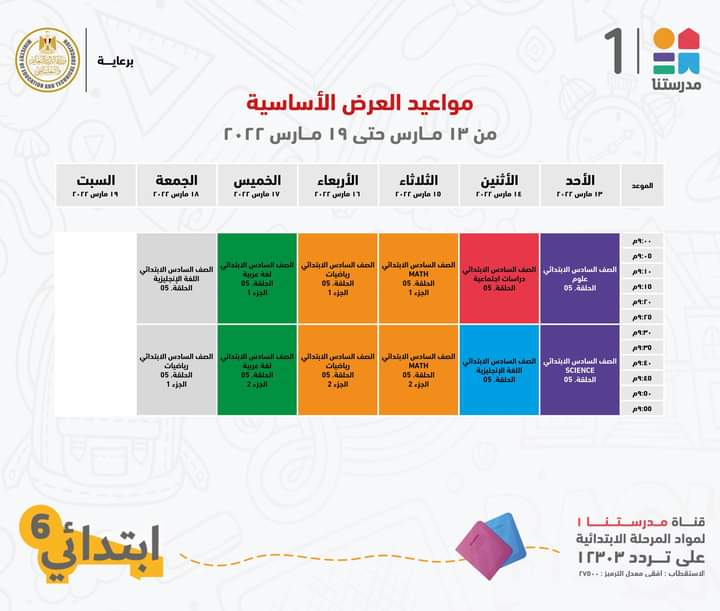 أعلنت قناة مدرستنا 1، التابعة لوزارة التربية والتعليم والتعليم الفني، الجدول الخاص بالصف السادس الابتدائي مع الإعادة.
