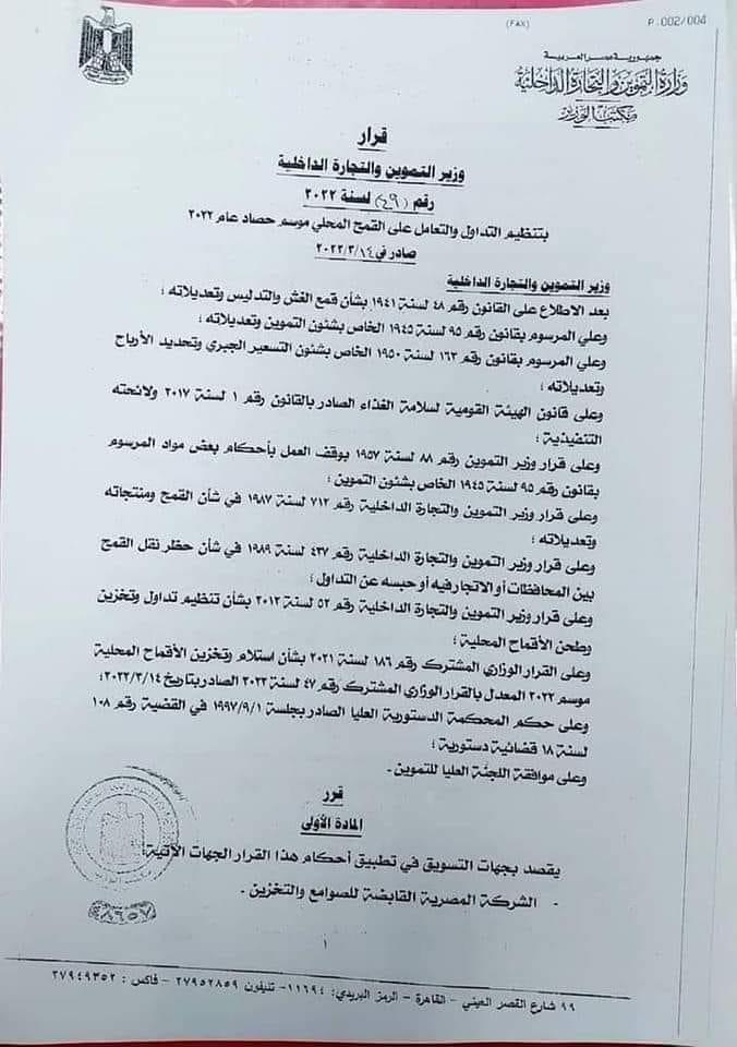 ونصت المادة الثانية من قرار وزير التموين على أنه يجب على كل من يملك محصولًا من القمح الناتج عن موسم حصاد عام 2022، أن يسلم لجهات التسويق جزءًا من المحصول بواقع 12 إردبا عن كل فدان كحد أدنى، وذلك بناء على الحيازة الزراعية المسجلة بوزارة الزراعة والجمعيات الزراعية.