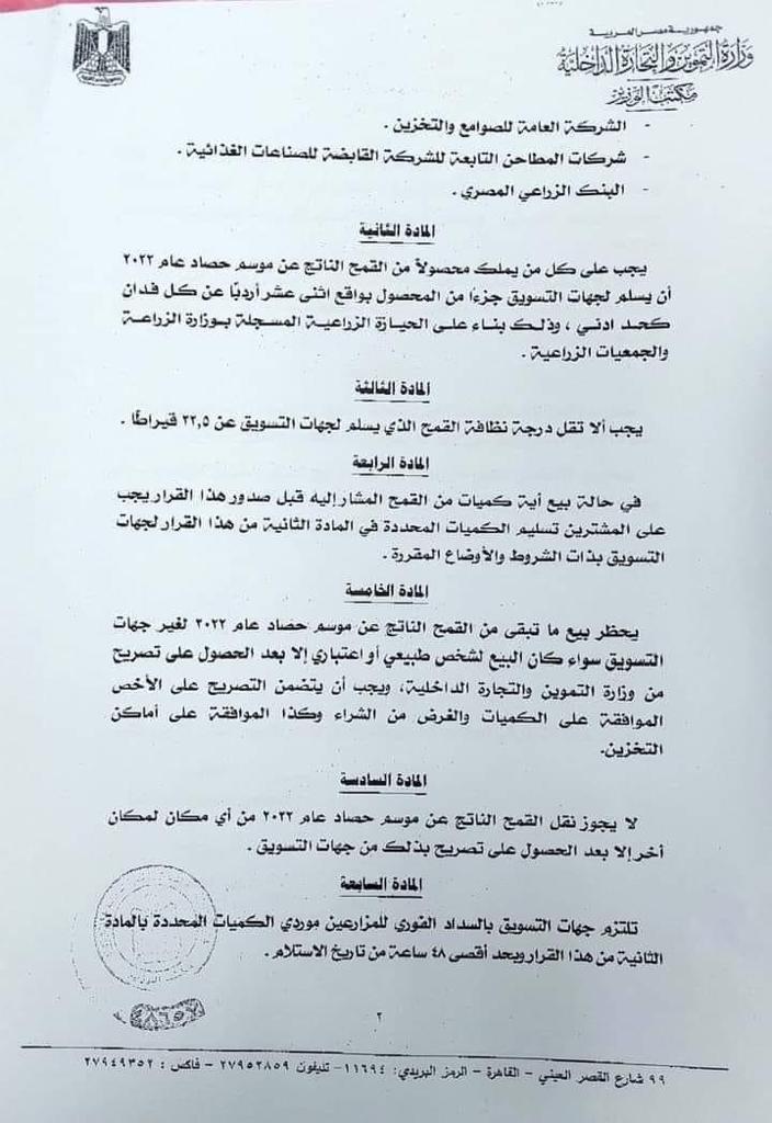 يحظر بيع ما تبقى من القمح الناتج عن موسم حصاد عام 2022 لغير جهات التسويق، سواء كان البيع لشخص طبيعي أو اعتباري إلا بعد الحصول على تصريح من وزارة التموين والتجارة الداخلية، ويجب أن يتضمن التصريح على الأخص الموافقة على الكميات والغرض من الشراء وكذا الموافقة على أماكن التخزين.