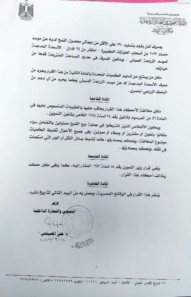 المادة السابعة فقد نصت على: تلتزم جهات التسويق بالسداد الفوري للمزارعين موردي الكميات المحددة بالمادة الثانية من هذا القرار وبحد أقصى 48 ساعة من تاريخ الاستلام، ويصرف لمن يقوم بتسليم 90% على الأقل من إجمالي محصول القمح لديه موسم حصاد 2022، من أصحاب الحيازات الكبيرة أي أكثر من 25 فدان، تصرف له الأسمدة المدعمة لموسم الزراعة الصيفي، ويكون الصرف في حدود المساحة المنزرعة قمحا من حيازته.