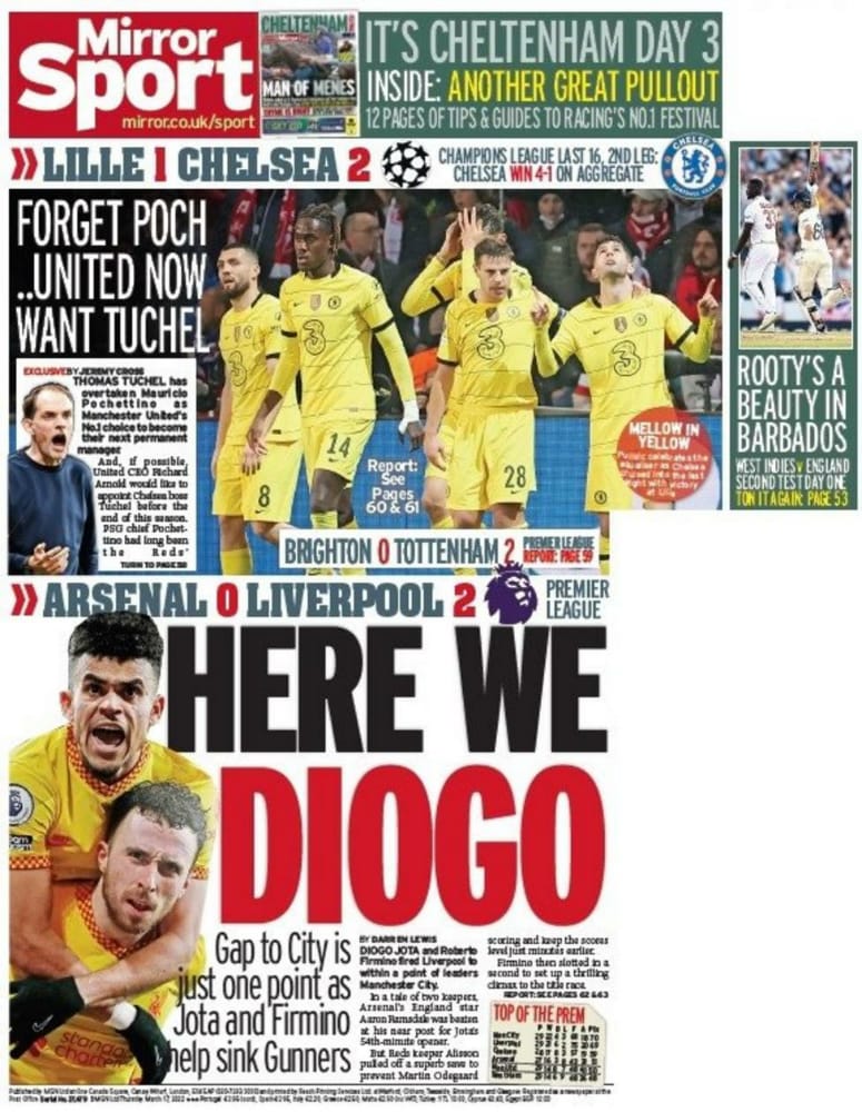 أشادت ميرور بالنجم البرتغالي ديوجو جوتا، وذلك تحت عنوان ليفربول يقلص الفارق مع السيتي إلى نقطة، بعد هدف جوتا وتأكيد فيرمينو.