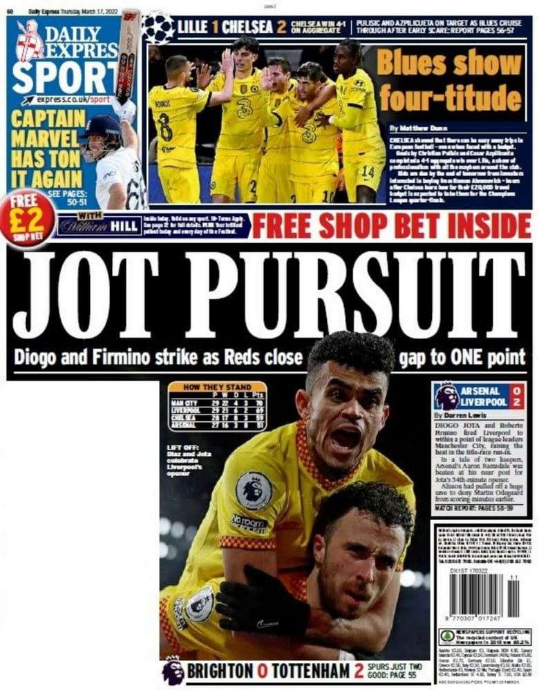 سلطت إكسبريس الضوء على ضغط ليفربول على مانشستر سيتي في سباق الصدارة، حيث قالت في غلافها: ديوجو جوتا وفيرمينو يقودان ليفربول للفوز على أرسنال، ويصبح الفارق نقطة مع السيتي.