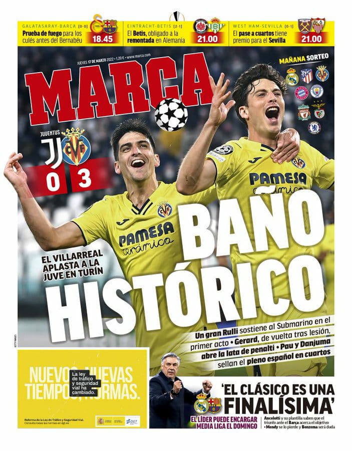 سلطت ماركا الضوء على لقاء الكلاسيكو المقبل بين برشلونة وريال مدريد، حيث جاء في غلافها: الكلاسيكو نهائي الليجا... يمكن للمتصدر أن يسيطر على نصف الدوري يوم الأحد.