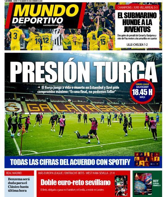 عنونت موندو ديبورتيفو في غلافها بـ الضغط في تركيا، وأفادت الصحيفة إلى أن برشلونة يلعب للحياة أو الموت في إسطنبول، وتشافي يطلب أقصى قدر من الالتزام.
