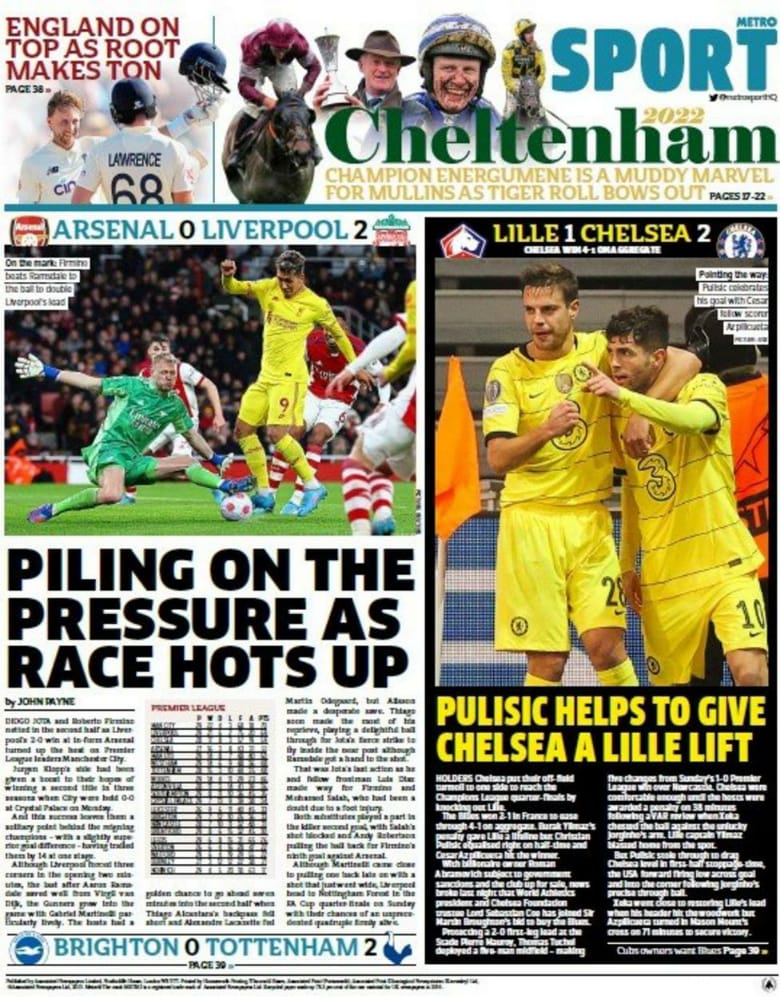 تصدر العنوان: الاستمرار في الضغط.. ليفربول يشعل سباق الصدارة، غلاف صحيفة مترو، وذلك بعد فوز ليفربول على نظيره أرسنال واقترابه من خطف الصدارة من مانشستر سيتي.