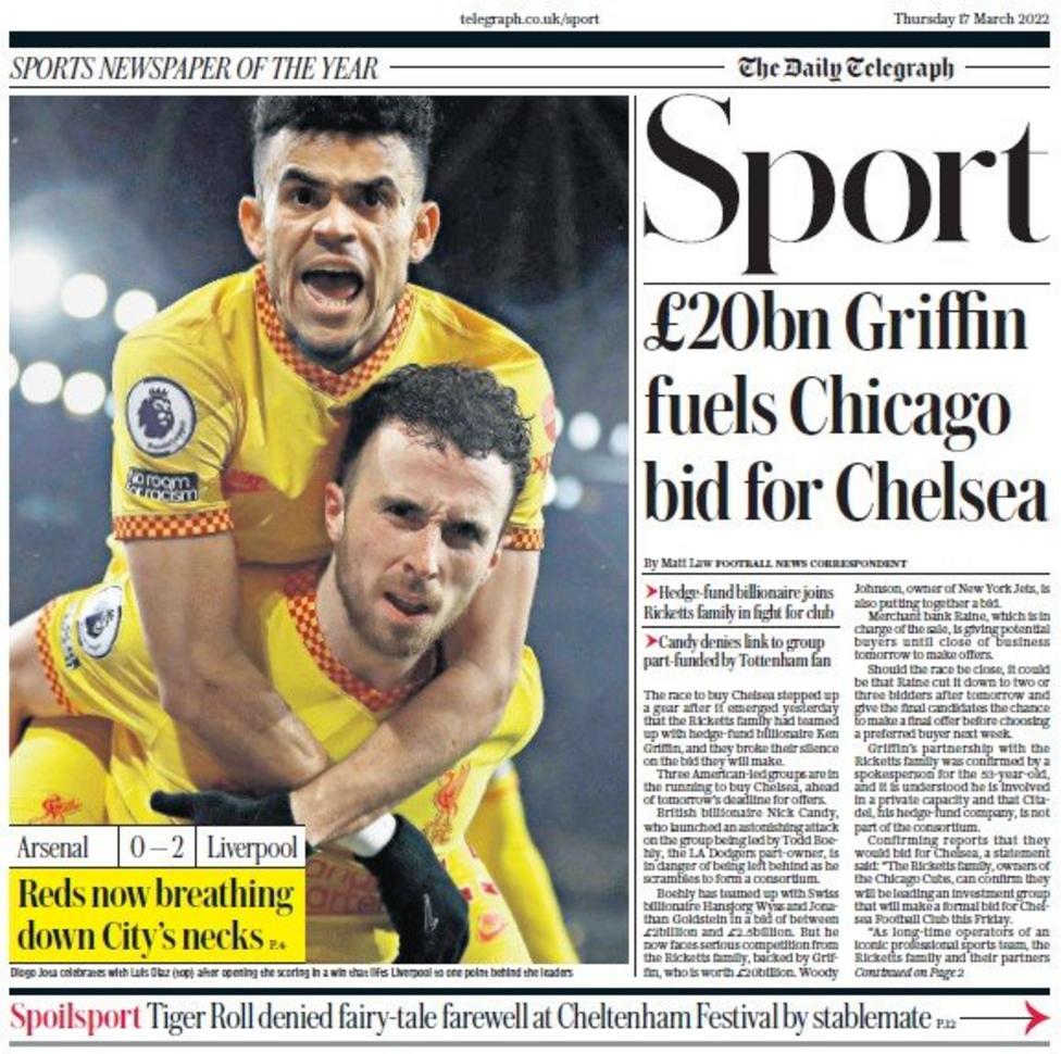 عنونت تيليجراف في غلافها بـ ليفربول يتنفس الآن عند عنق مانشستر سيتي، وذلك بعدما رفع الريدز رصيده إلى 69 نقطة بفارق نقطة عن السيتي المتصدر، برصيد 70 نقطة.
