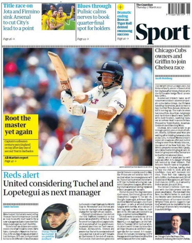 كشفت جارديان في غلافها تطورات تعاقد مانشستر يونايتد مع مدرب جديد، حيث قالت: توخيل ولوبيتيجي أبرز خيارات يونايتد لتدريب الفريق بعد رانجنيك.