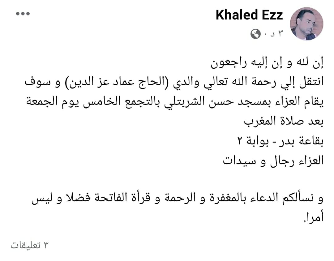 وكتب خالد عز عبر حسابه الشخصي بموقع التواصل الاجتماعي فيس بوك: إن لله وإن إليه راجعون، انتقل إلى رحمة الله تعالى والدي، الحاج عماد عز الدين، وسوف يقام العزاء بمسجد حسن الشربتلي بالتجمع الخامس، يوم الجمعة بعد صلاة المغرب، بقاعة بدر - بوابة ٢، العزاء رجال وسيدات، ونسألكم الدعاء بالمغفرة والرحمة وقراءة الفاتحة فضلا وليس أمرًا.