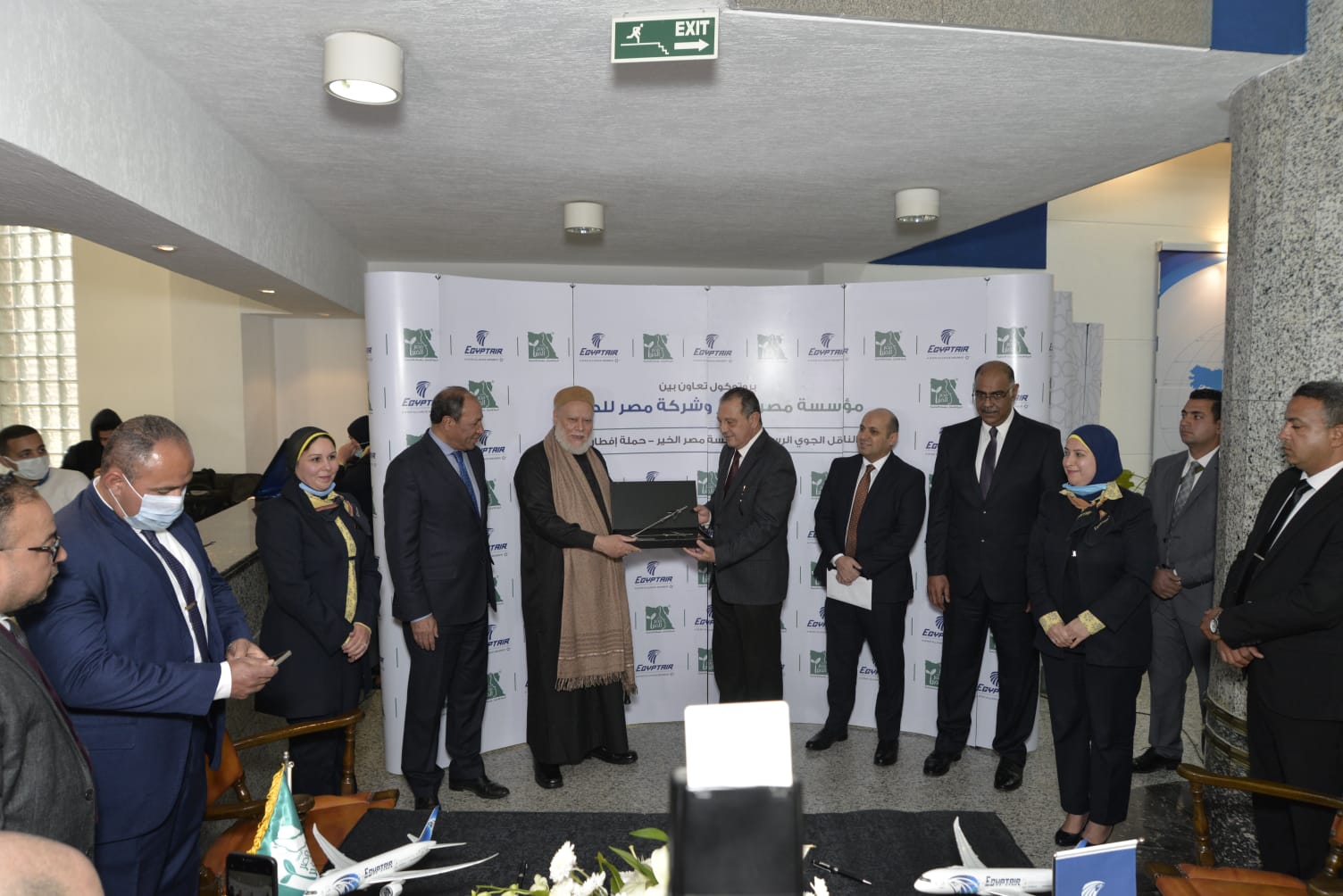 جاء ذلك بحضور فضيلة الدكتور علي جمعة، رئيس مجلس أمناء مؤسسة مصر الخير، وعضو هيئة كبار العلماء، الطيار عمرو أبوالعينين، رئيس مجلس إدارة الشركة القابضة لمصر للطيران، الطيار حسن منير، مساعد رئيس مجلس إدارة الشركة القابضة، الطيار عمرو نبيل، رئيس مجلس إدارة شركة مصر للطيران للخطوط الجوية، أحمد شاهين، رئيس مجلس إدارة شركة مصرللطيران للشحن الجوي، ومحمد عبد الرحمن، الرئيس التنفيذي لمؤسسة مصر الخير.