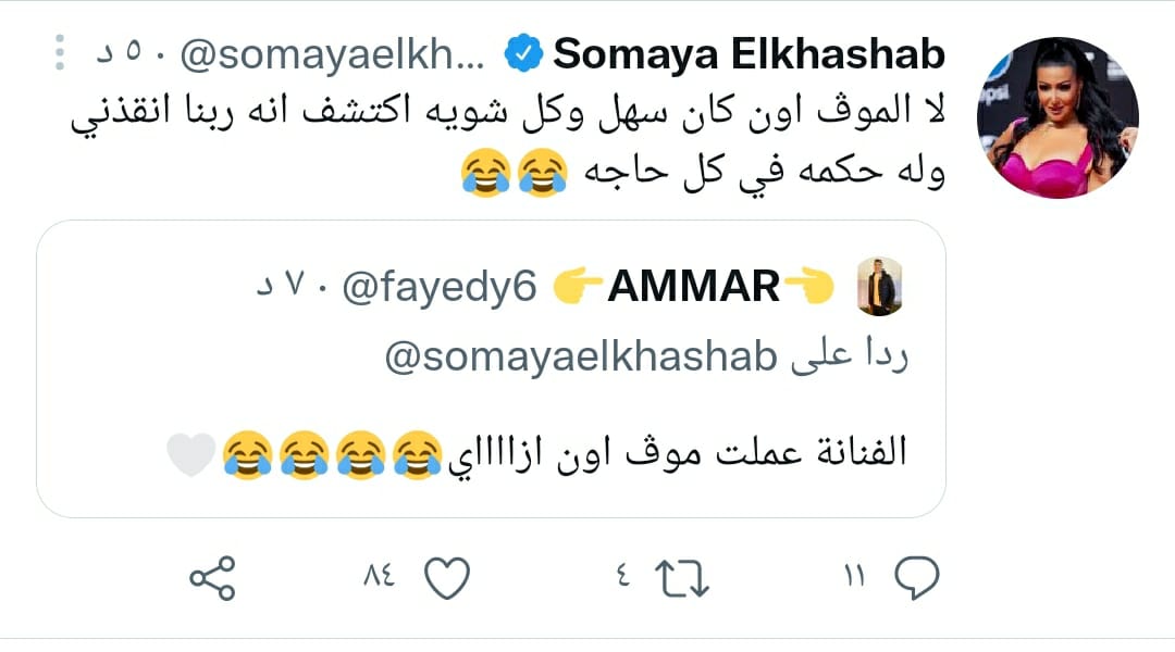 وكتبت أحد المتابعين لـ سمية الخشاب عبر حسابه الشخصي بموقع تويتر، سؤالًا جاء فيه: الفنانة عملت موف أون أزاي، لترد الأخيرة: لا الموف أون كان سهل، وكل شوية اكتشف أن ربنا أنقذني، وله حكمة في كل حاجة.