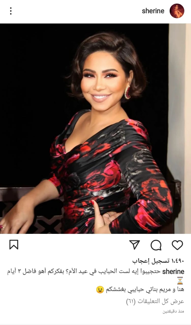 وعلقت شيرين عبد الوهاب على الصورة، قائلة: هتيجبوا إيه لست الحبايب في عيد الأم؟ بفكركم أهو فاضل 3 أيام.. هنا ومريم بناتي حبايبي بغششكم.
