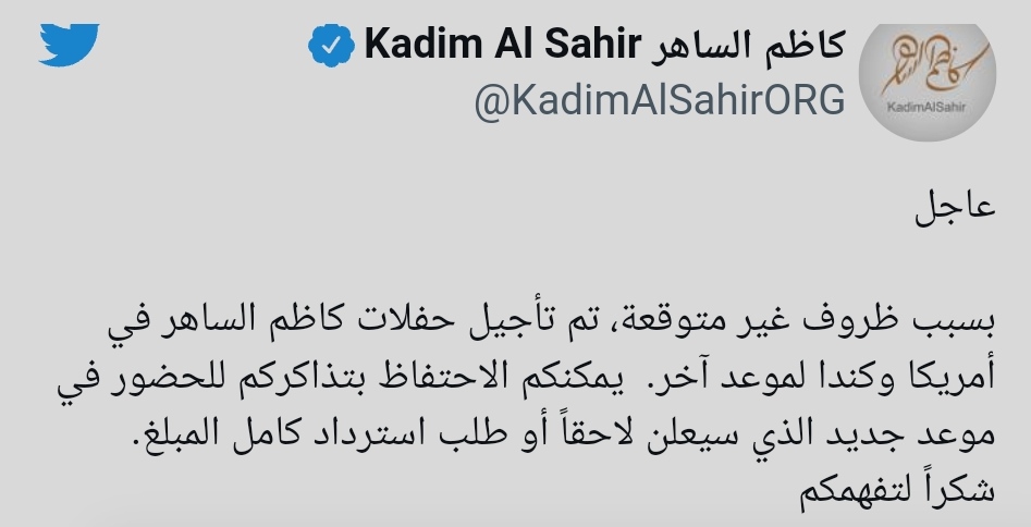 وكان من المقرر أن يحيي كاظم الساهر 8 حفلات غنائية، ضمن جولته الغنائية في أمريكا وكندا، التي أحيا منها حفلتين فقط، وتبقى منها 6 حفلات، لكن الأخير أجل هذه الحفلات لوفاة زوجته الأولى عروسة الساهر، والدة أبنائه، ولم يكشف حتى الآن الموعد الجديد لهذه الحفلات.