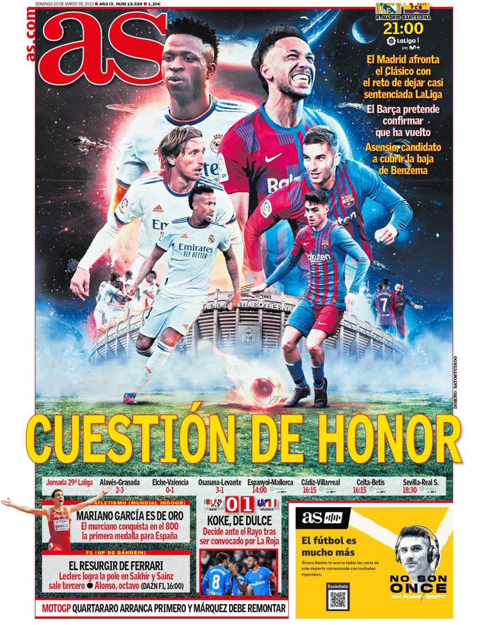 تصدر العنوان، مسألة شرف، غلاف صحيفة آس الإسبانية لعدد اليوم، وذلك مع استخدام الصحيفة تلك العبارة لوصف الكلاسيكو الحالي، حيث أوضحت أن ريال مدريد يقترب من حسم الكلاسيكو وعلى وشك التتويج النهائي بالدوري الإسباني.