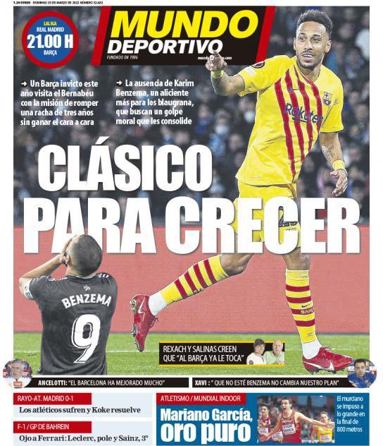 عنونت موندو ديبورتيفو في غلافها اليوم بالعنوان كلاسيكو النمو لبرشلونة، حيث قالت الصحيفة إن برشلونة غير المهزوم هذا العام يزور البرنابيو بهدف كسر خط 3 سنوات دون الفوز في المواجهات المباشرة.