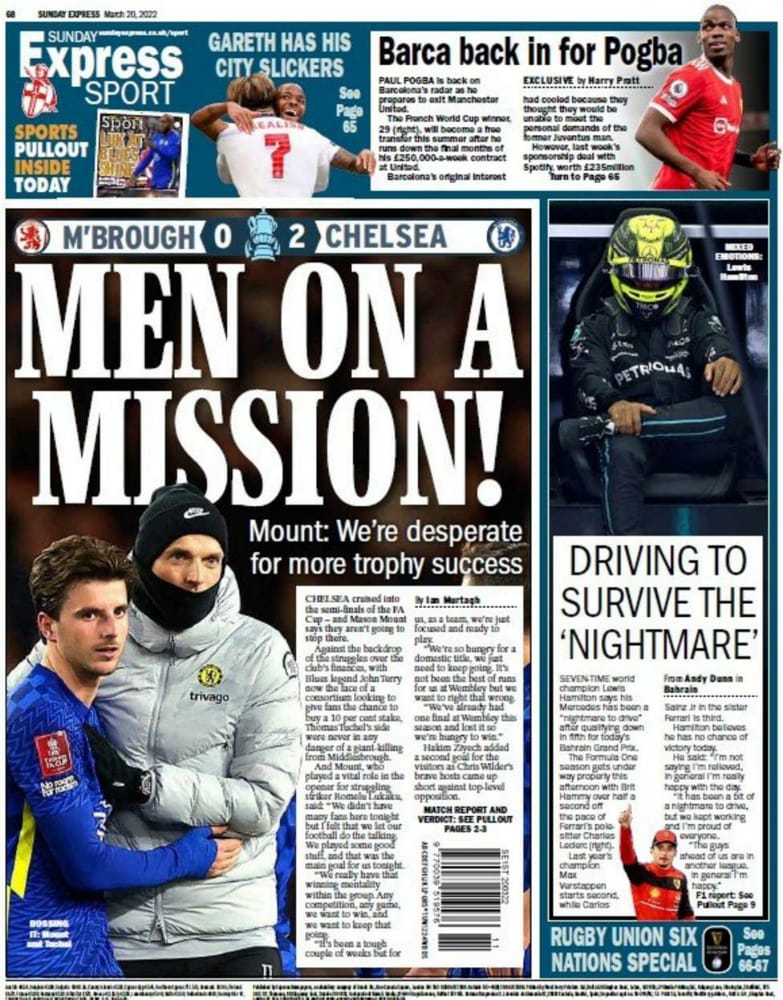 عنونت إكسبريس في غلافها بـ الرجال في مهمة، وذلك مع تصدر توخيل غلاف الصحيفة والإشادة بأداء البلوز أمام ميدلزبره في الكأس رغم الأزمات الأخيرة.