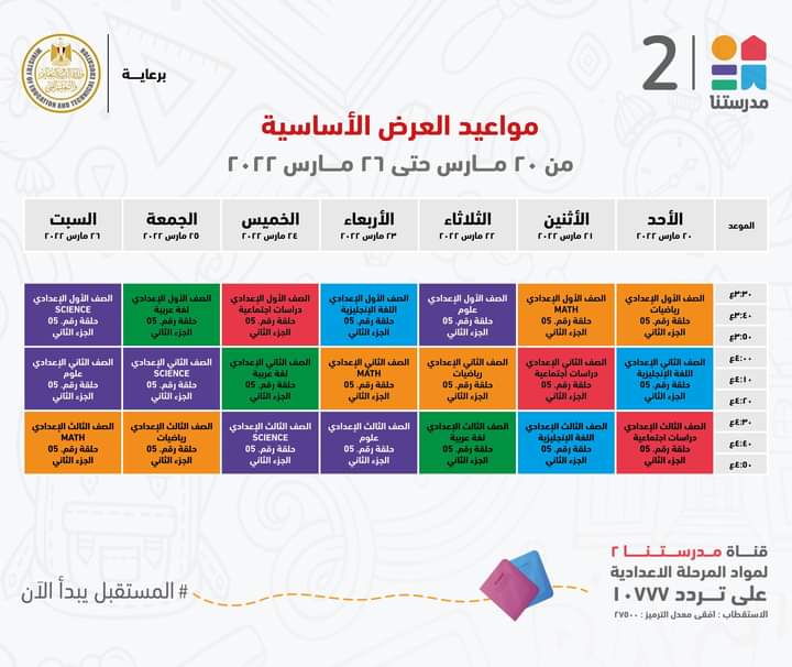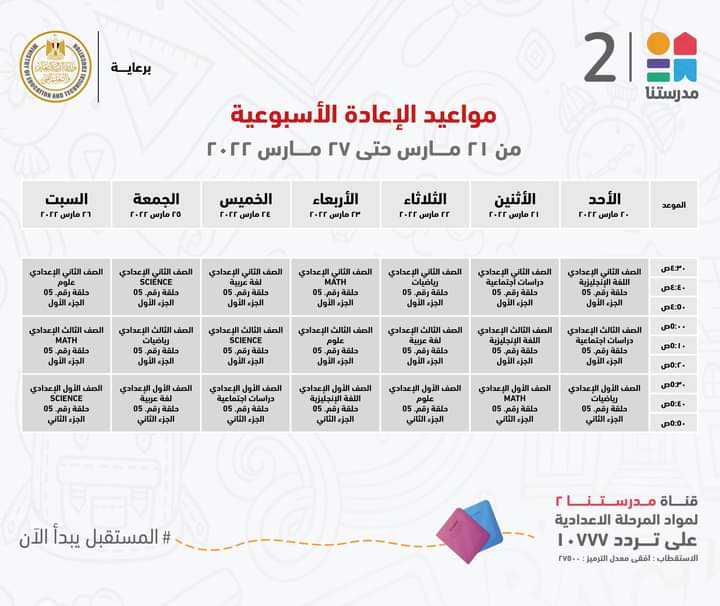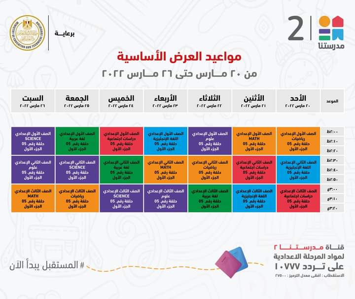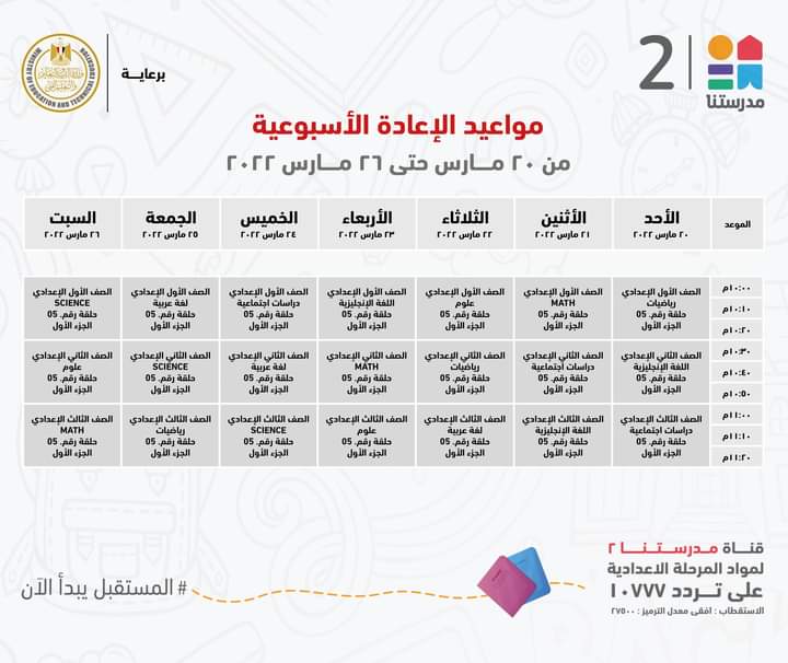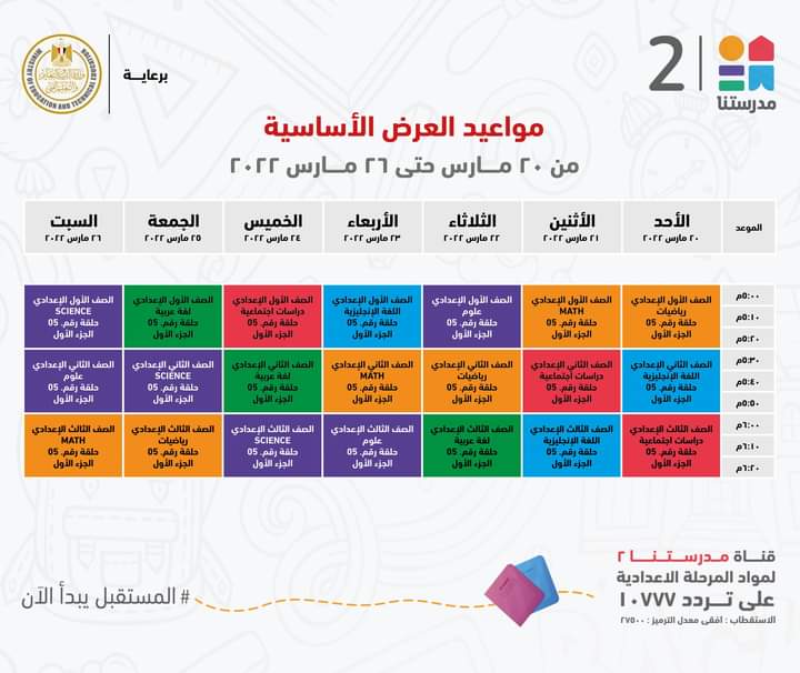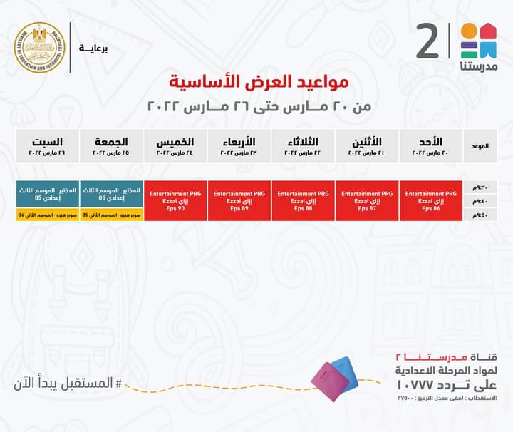 أعلنت وزارة التربية والتعليم والتعليم الفني، جداول مواعيد عرض البرامج التعليمية للمناهج الدراسية المقررة على جميع طلاب المرحلة الإعدادية، والتي من المقرر بثها على قناة مدرستنا 2.