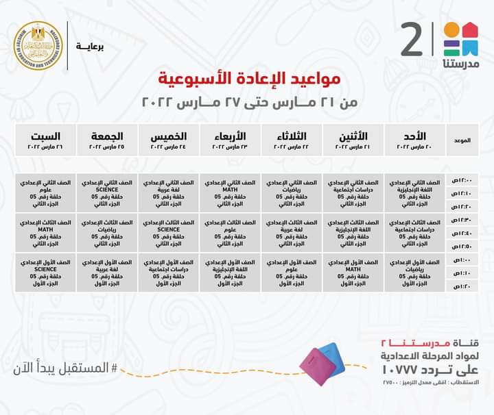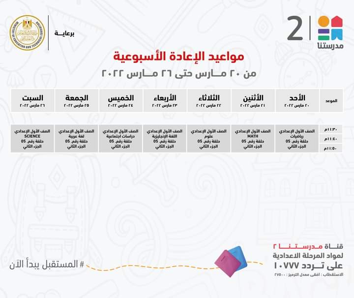ونشرت القناة عبر صفحتها الرسمية على موقع التواصل الاجتماعي، فيسبوك، قائلة: إنه يمكنكم يا أعزاءنا متابعة مواعيد عرض البرامج التعليمية الخاصة بالصفوف الإعدادية للأسبوع الـ 5 للفصل الدراسي الثاني مع الإعادة على التردد 10777 أفقي.