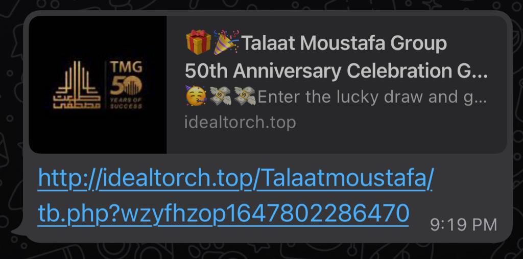 وأعلنت مجموعة طلعت مصطفي عدم مسؤوليتها عن هذا اللينك المزيف، وتشدد على أنها لا ترسل أي لينكات، وأن أي دعاية أو إعلانات خاصة بالشركة يتم نشرها فقط على موقعها الرسمي وعبر الصفحات الرسمية للشركة.
