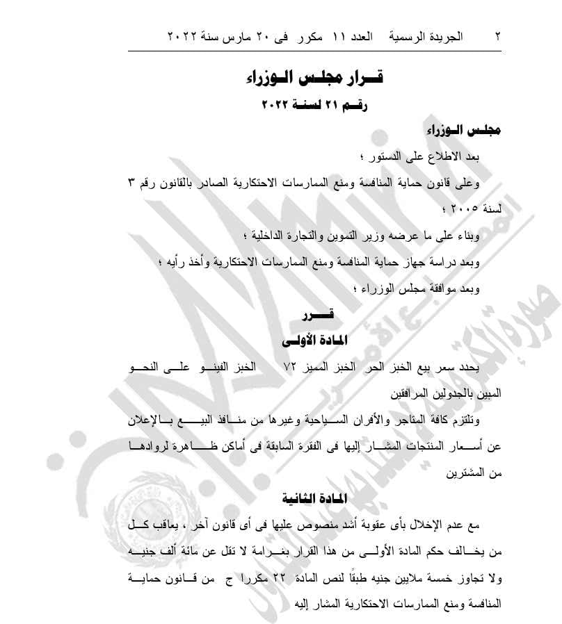 نشرت الجريدة الرسمية في عددها الصادر اليوم الاثنين قرار رئيس مجلس الوزراء الدكتور مصطفى مدبولي بتحديد أسعار الخبز الحر (الخبز المميز 72% – الخبز الفينو).