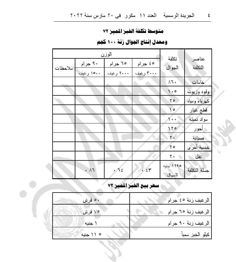 وقد حدد القرار سعر بيع الخبز المميز رغيف زنة 45 جرام: 50 قرشا و رغيف 65 جرام: 75 قرشا و رغيف 90 جرام: جنيه واحد بينما كيلو خبز معبأ: 11.5 جنيه