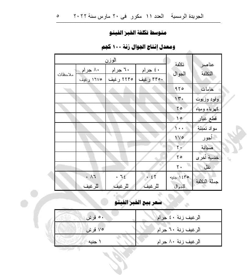 كما حدد القرار سعر بيع رغيف الفينو زنة 40 جرام: 50 قرشا و رغيف 60 جرام: 75 قرشا و رغيف 80 جرام: جنيه واحد.