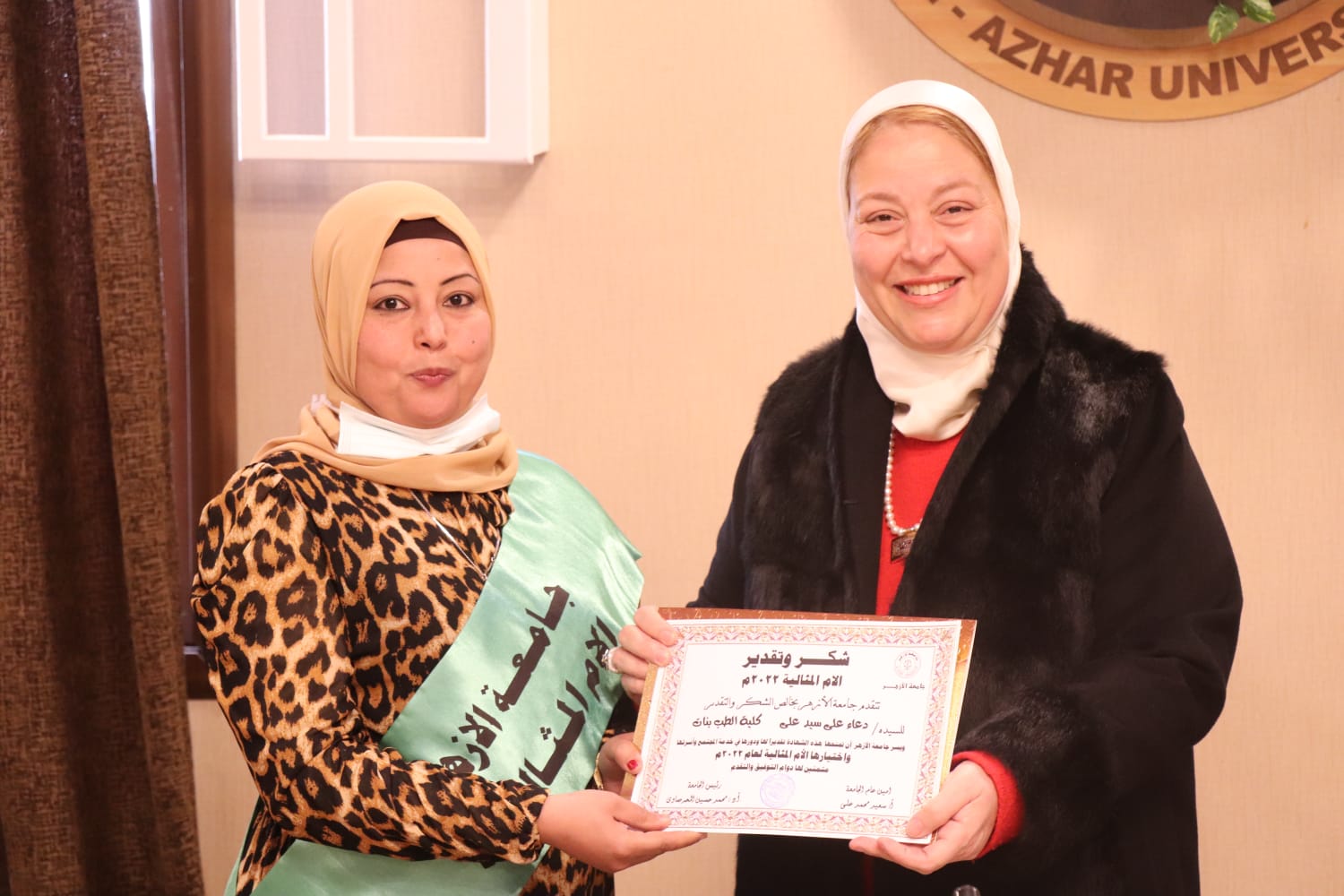 كرّم الدكتور محمد المحرصاوي، رئيس جامعة الأزهر، والدكتور محمود صديق، نائب رئيس الجامعة للدراسات العليا والبحوث، وسعيد محمد علي عبد الرحيم، أمين عام الجامعة، والدكتورة هناء العبيسي، عميدة كلية طب البنات جامعة الأزهر بالقاهرة، الأمهات المثاليات على مستوى جامعة الأزهر بمقر إدارة الجامعة بمدينة نصر.