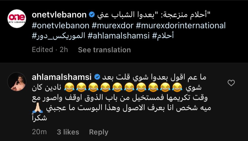ردت المطربة الإماراتية أحلام الشامسي، على جدل الفيديو المتداول؛ التي انفعلت فيه على إحدى المعجبين، أثناء تواجدها حفل الموريكس دور بنسخته الدولية الأولى في أتلانتس دبي.