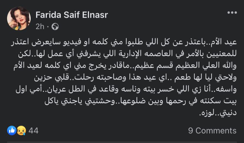 وكتبت فريدة سيف نصر، عبر حسابه الشخصي بموقع التواصل الاجتماعي فيسبوك: عيد الأم.. بعتذر عن كل اللي طلبوا مني كلمة أو فيديو، أعتذر للمعنيين بالأمر في العاصمة الإدارية، اللي يشرفني أي عمل لها، لكن والله العلي العظيم قسم عظيم، ما قادرة يخرج مني أي كلمه لعيد الأم ولا حتي ليا لها طعم.