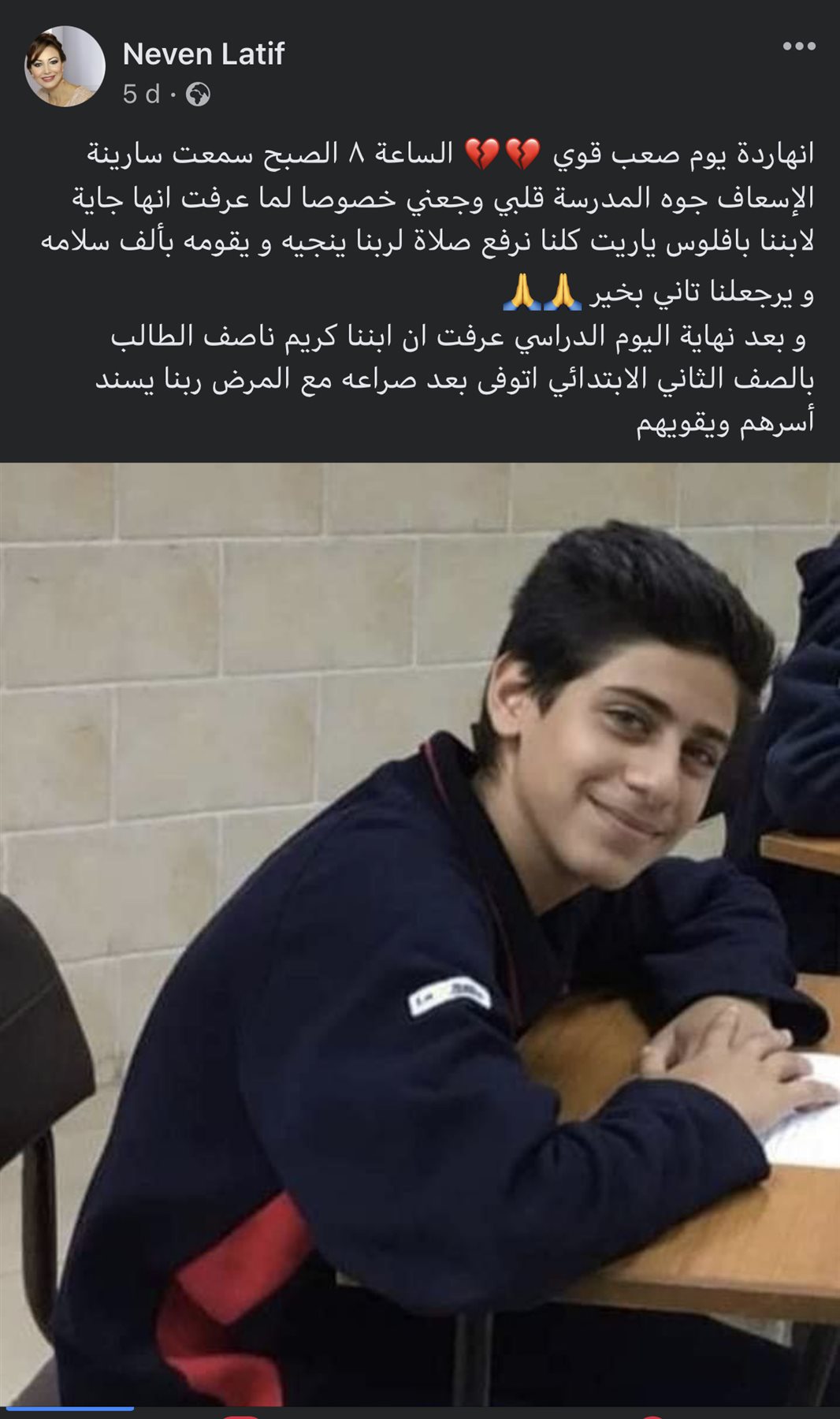 كما شهدت المدرسة أيضًا في نفس اليوم، وفاة طالب آخر، حيث كتبت نيفين لطيف، معلمة بمدرسة سان مارك بالإسكندرية، عبر صفحتها على فيسبوك: النهاردة يوم صعب قوي الساعة 8 الصبح، سمعت سارينة الإسعاف جوه المدرسة، قلبي وجعني خاصة لما عرفت إنها جاية لابننا بافلوس، ياريت كلنا نرفع صلاة لربنا ينجيه، وبعد نهاية اليوم الدراسي عرفت أن ابننا كريم ناصف، الطالب بالصف الثاني الابتدائي، توفى بعد صراعه مع المرض ربنا يسند أسرهم ويقويهم.