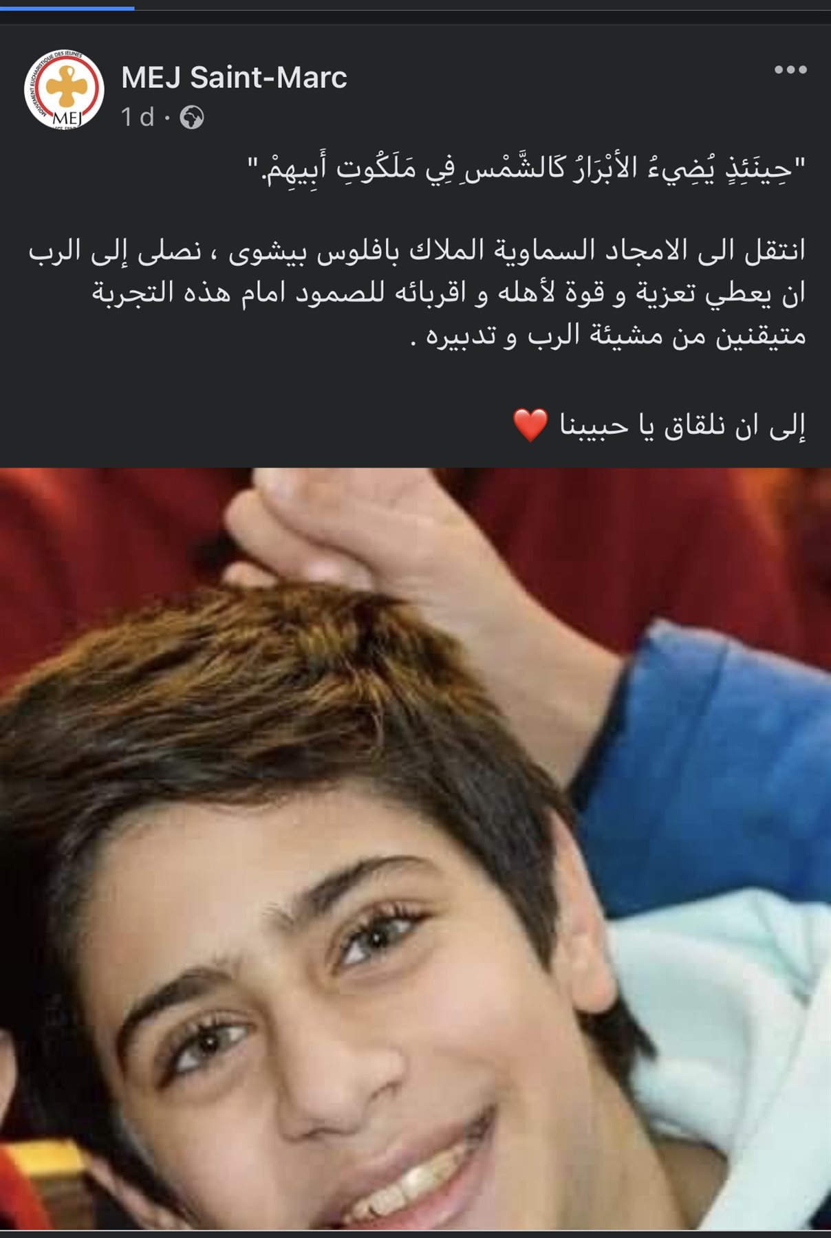 لفظ الطالب بافلوس بيشوي، المقيد بالصف الأول الإعدادي، بمدرسة سان مارك بالإسكندرية، أنفاسه الأخيرة، إثر تعرضه لإصابة بالغة داخل المدرسة، أدت إلى حدوث نزيف في المخ.