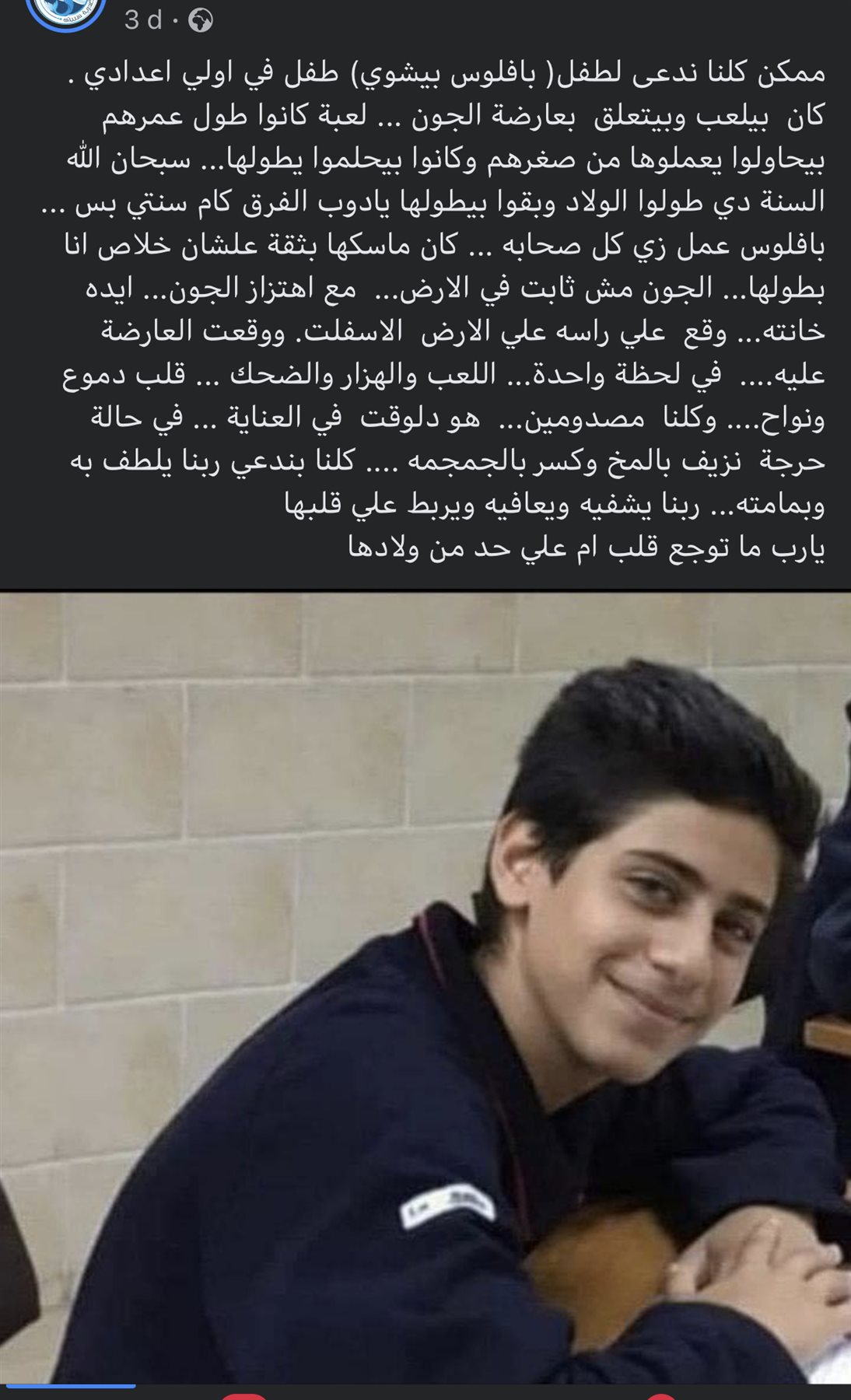وبحسب ما ذكرته أحد أولياء الأمور، عبر فيسبوك، أن لحظات إصابة الطفل كانت مرعبة، إثر وقوع عارضة الجون على الطالب في أثناء اللعب، ولفظ بافلوس أنفاسه الأخيرة فور نقله إلى المستشفى.