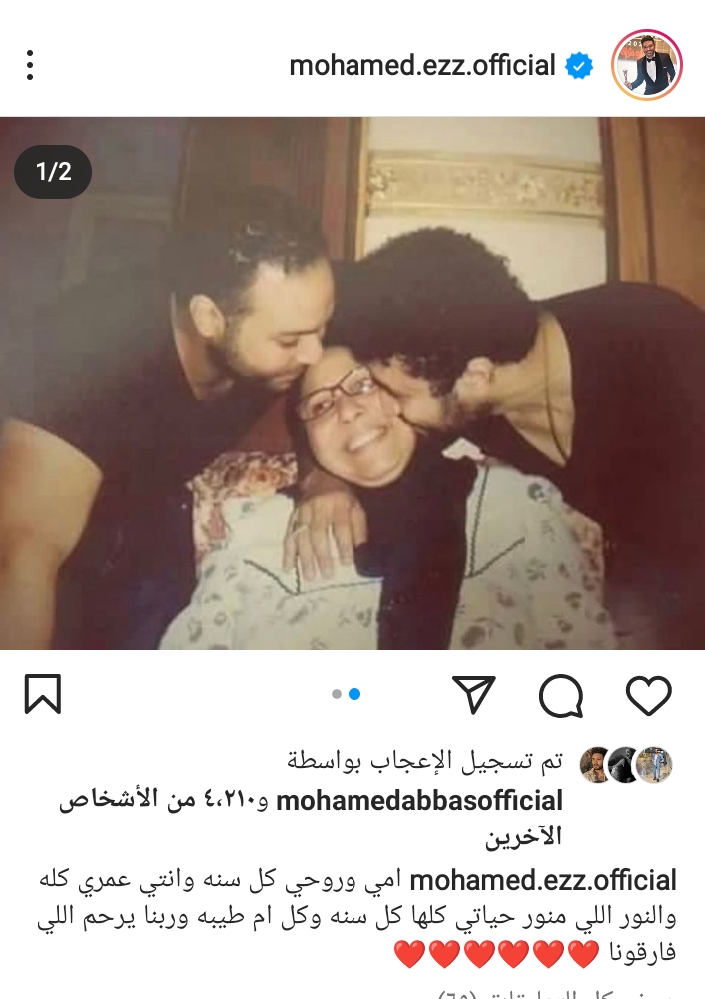 وكتب محمد عز، على الصورة عبر حسابه الشخصي، بموقع إنستجرام، وعلق عليها قائلًا: أمي وروحي، كل سنة وإنتِ عمري كله، والنور اللي منور حياتي كلها، كل سنة وكل أم طيبة وربنا يرحم اللي فارقونا.