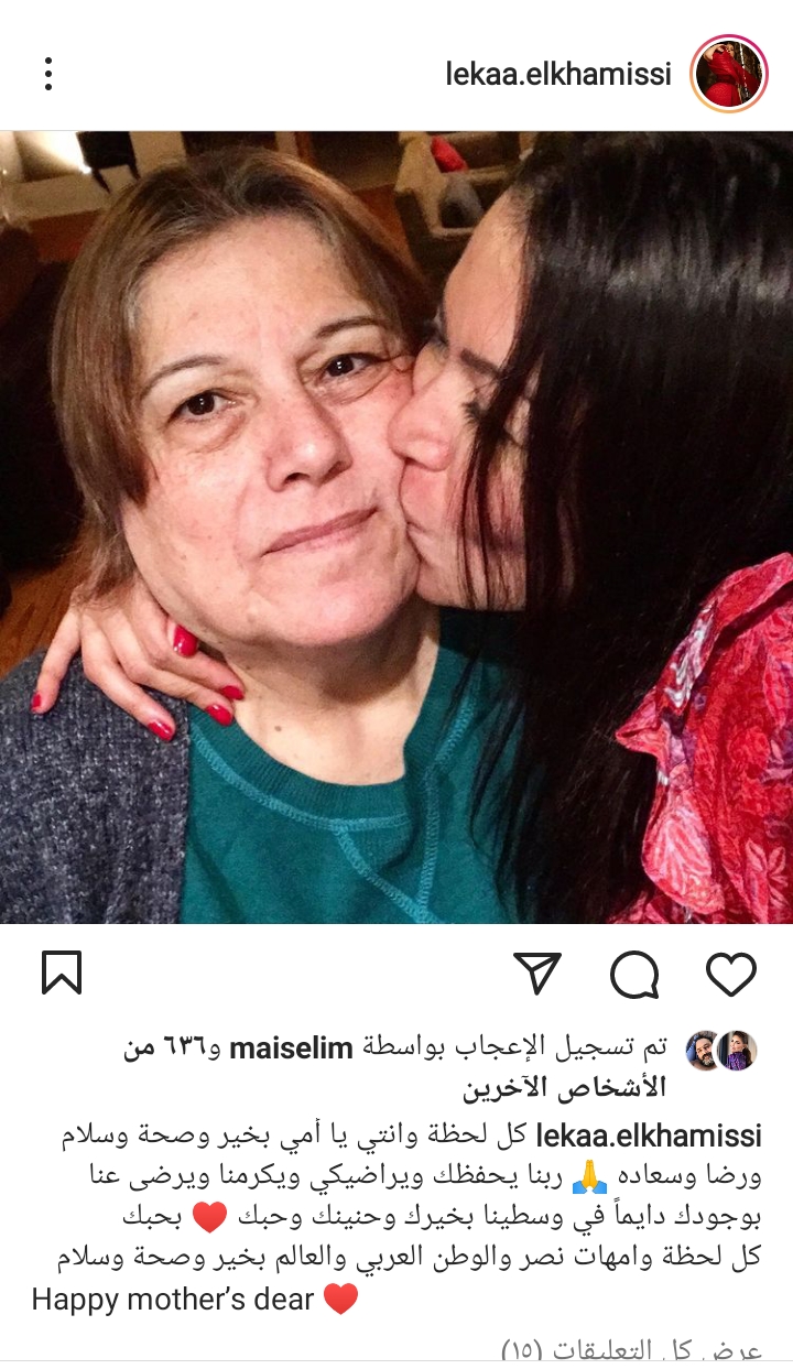 ونشرت لقاء، على الصورة عبر حسابها الشخصي بموقع تبادل الصور والفيديوهات القصير انستجرام، وعلق: كل لحظة وإنتِ يا أمي بخير وبصحة وسلام ورضا وسعادة، ربنا يحفظك ويراضيكي، ويكرمنا ويرضى عنا بوجودك ودايمًا وسطينا بخيرك وحنينك وحبك، بحبك.