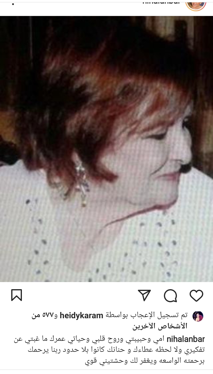 كما حرصت نهال عنبر، على تهنئة والدتها بعيد الأم، حيث شاركت صورة لوالدتها عبر حسابها الشخصي بموقع إنستجرام، وعلقت عليها: أمي حبيبتي وروح قلبي وحياتي عمرك ماغبتي عن تفكيري ولا لحظة عطاءك وحنانك كانوا بلا حدود ربنا يرحمك برحمتة الواسعة ويغفر لك وحشتيني قوي.