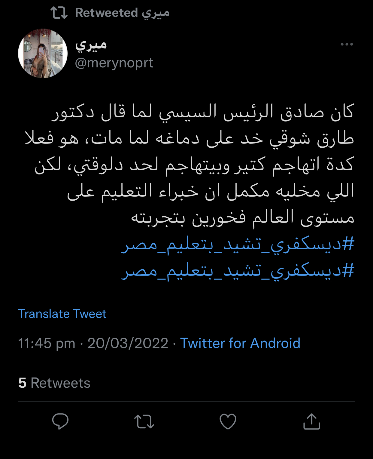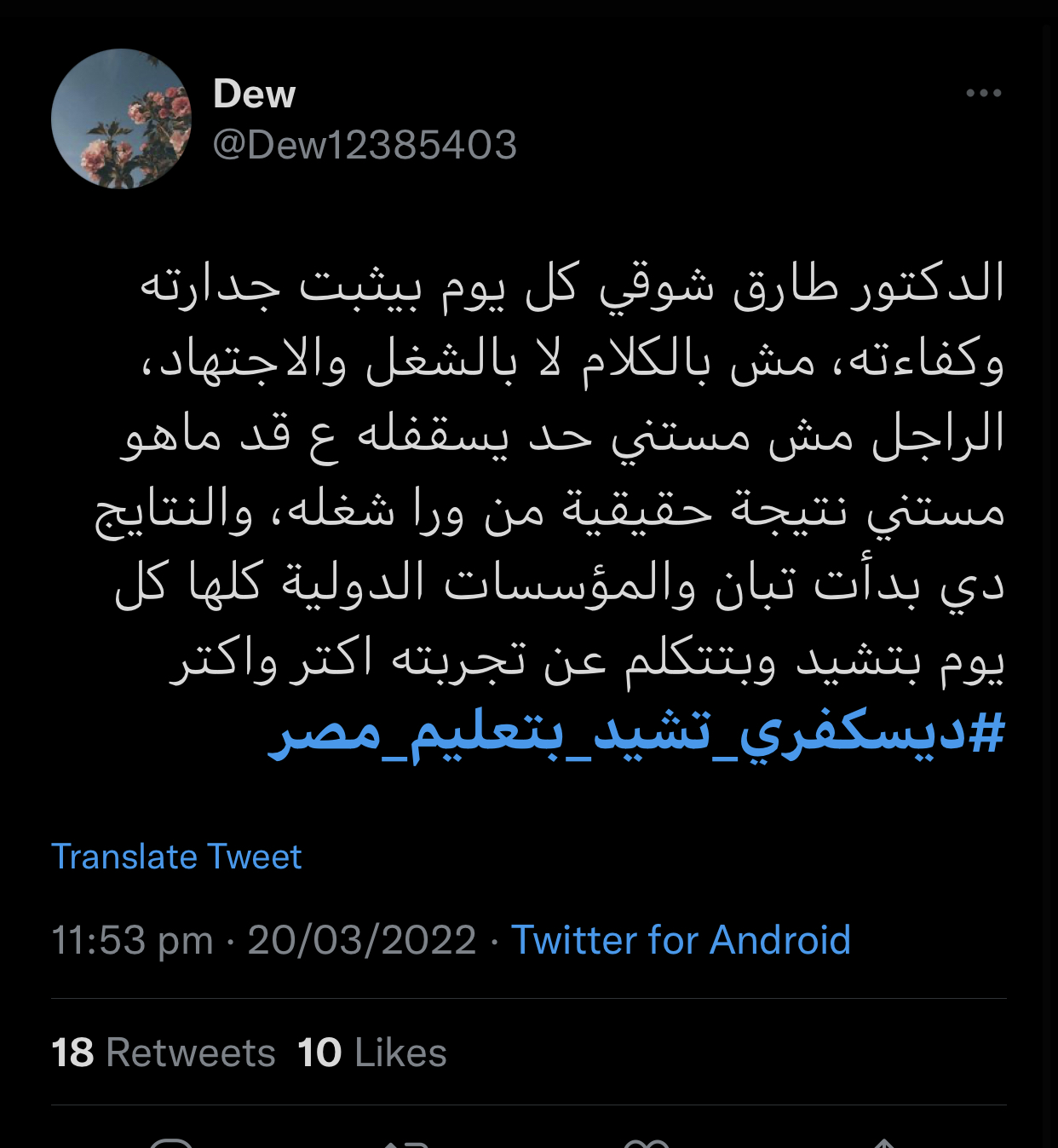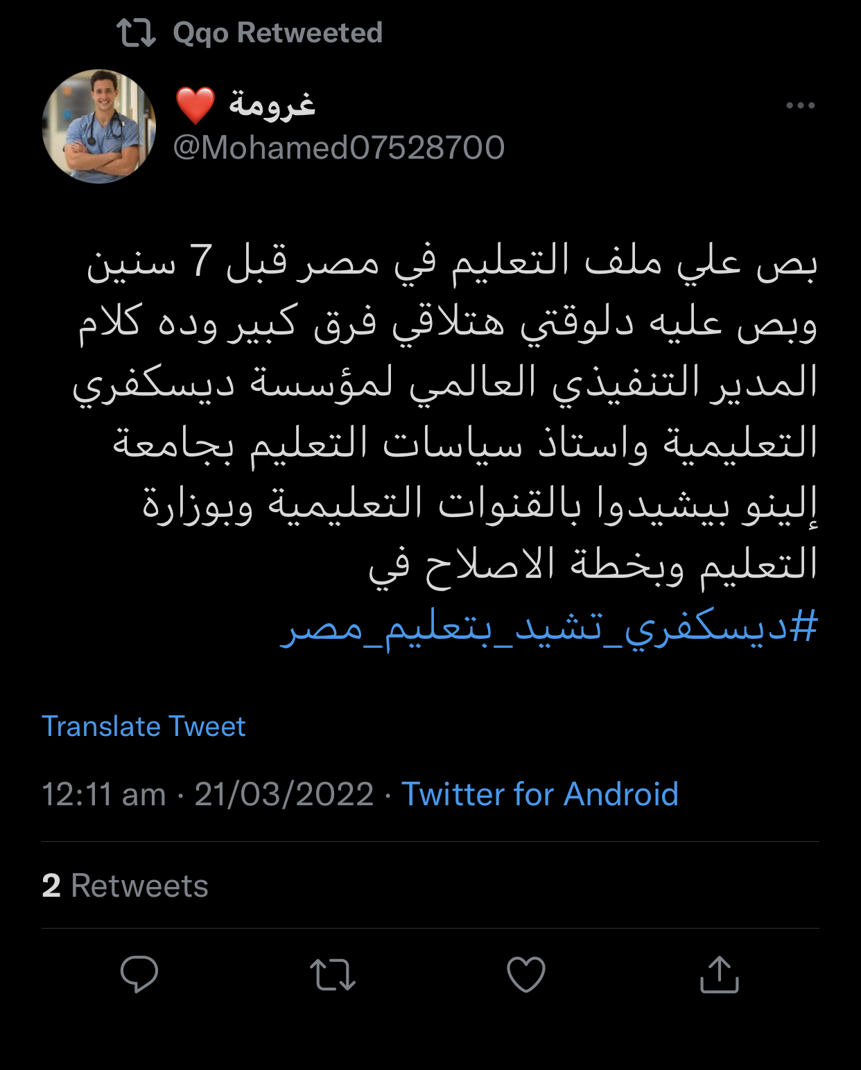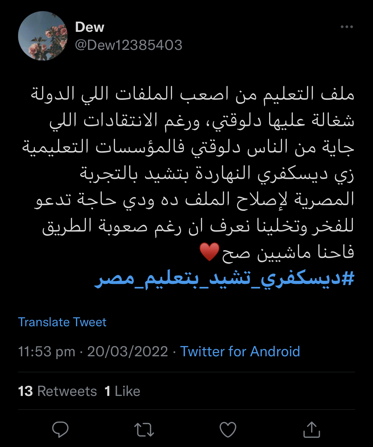 وكتب محمد غرام، عبر حسابه على تويتر، عن إشادة منصة ديسكفري قائلًا: مارتي كيرل، المدير التنفيذي العالمي لمؤسسة ديسكفري التعليمية بنفسه؛ أشاد بخطة تطوير التعليم في مصر وبالطالب المصري، وأنه من أذكى طلاب العالم.. إيه أخبار الناس اللي بتقول خطة تطوير التعليم مش كويسة دلوقتي ؟؟.