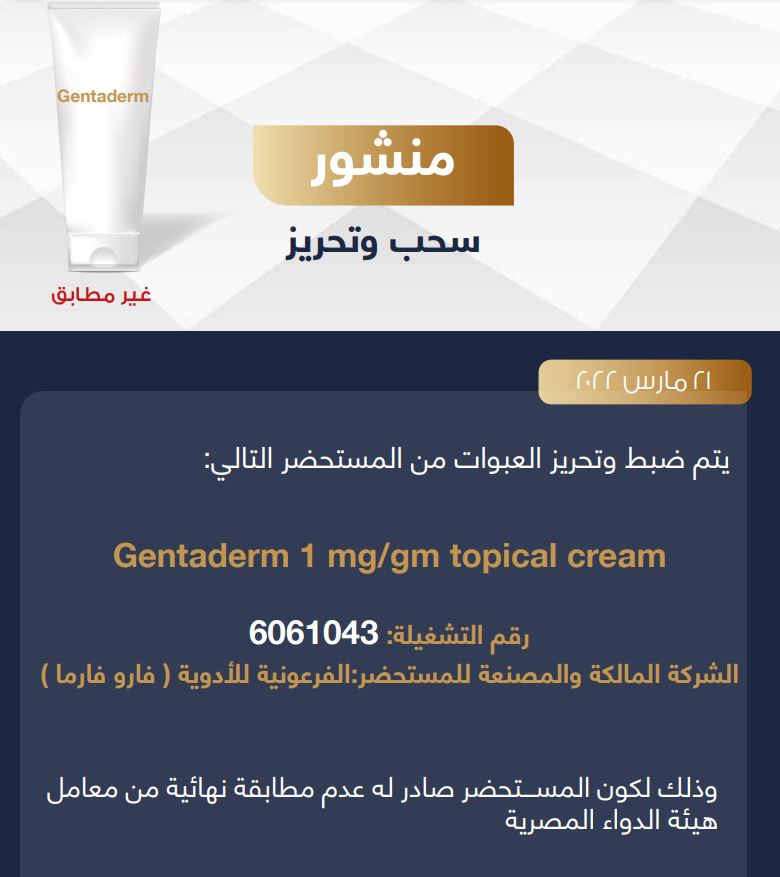 وأوضحت هيئة الدواء المصرية، في منشورها اليوم، أن الكريم الموضعي Gentaderm الصادر عن شركة الفرعونية للأدوية فارو فارما، يتم ضبطه وتحريزه لعدم مطابقة المستحضر نهائيا لمعامل الهيئة.