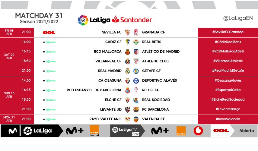 أعلن حساب الدوري الإسباني الرسمي عبر تويتر، موعد مباريات الجولة الـ 31 في المسابقة الإسبانية، التي جاء أبرزها مباراة ريال مدريد وخيتافي، ومباراة برشلونة أمام نظيره ليفانتي.