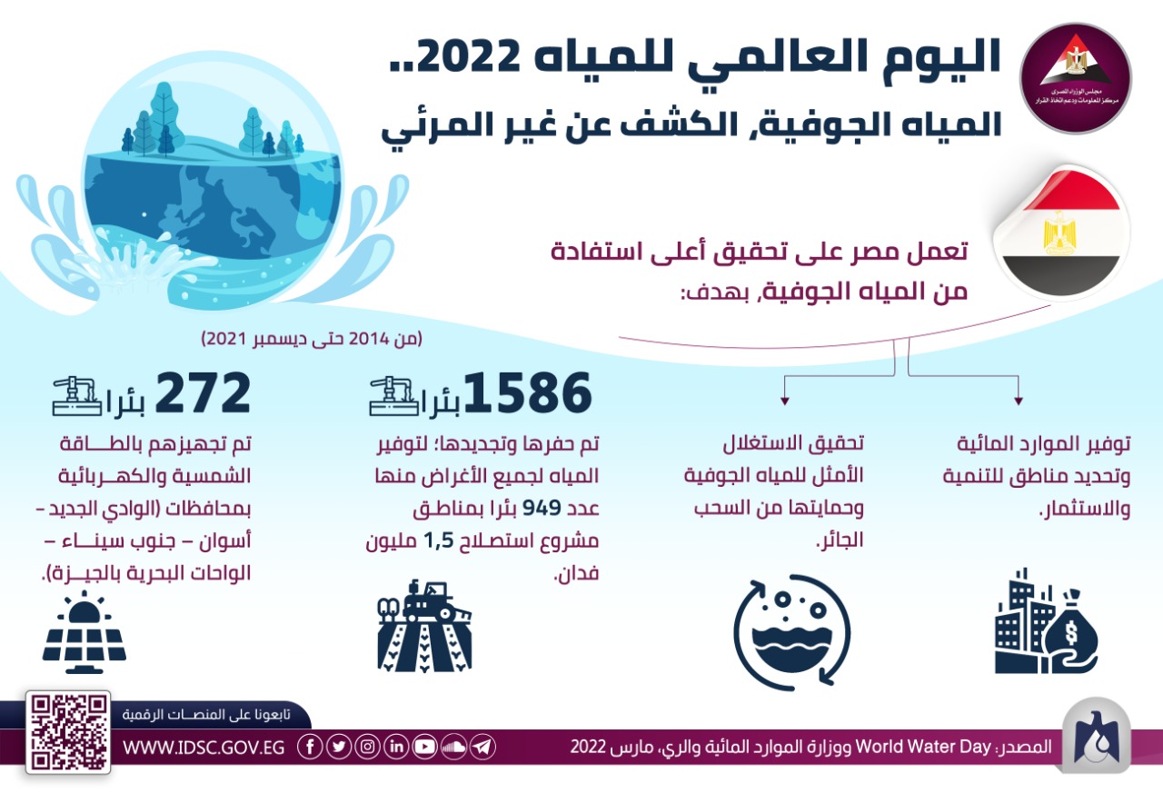 نشر مركز المعلومات ودعم اتخاذ القرار - التابع لـ مجلس الوزراء، إنفوجراف جديد، بمناسبة اليوم العالمي للمياه، وموضوع هذا العام، هو المياه الجوفية، وأهميتها في تعويض البلاد التي تعاني من الجفاف، ونُدرة المصادر الأخرى.