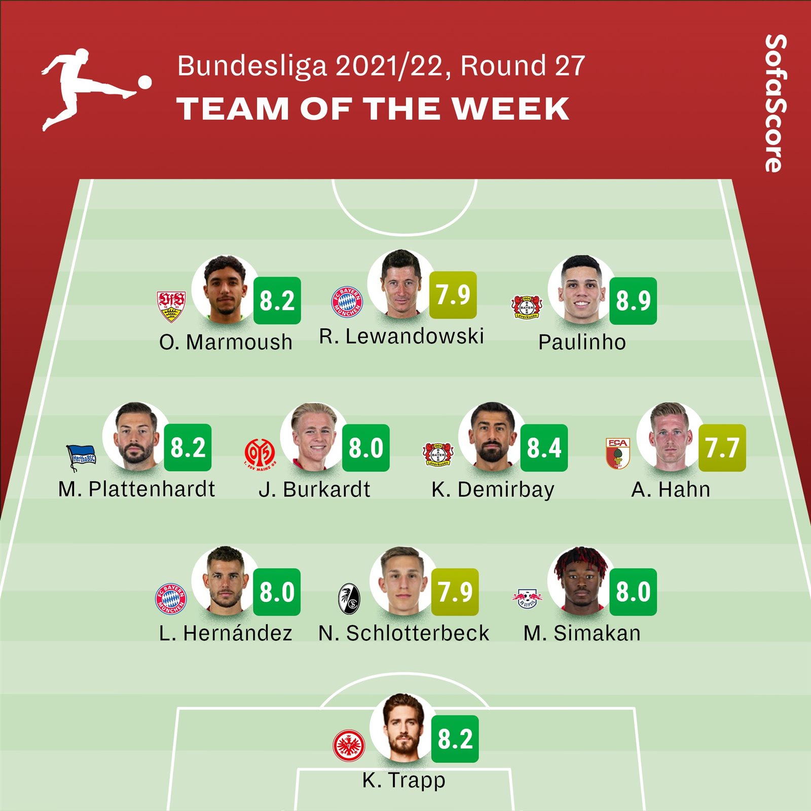 وشهد تشكيل الأفضل في الجولة الـ 27 تواجد عمر مرموش في الهجوم، بجانب روبرت ليفاندوفسكي لاعب بايرن ميونخ، وباولينيو مهاجم باير ليفركوزن.