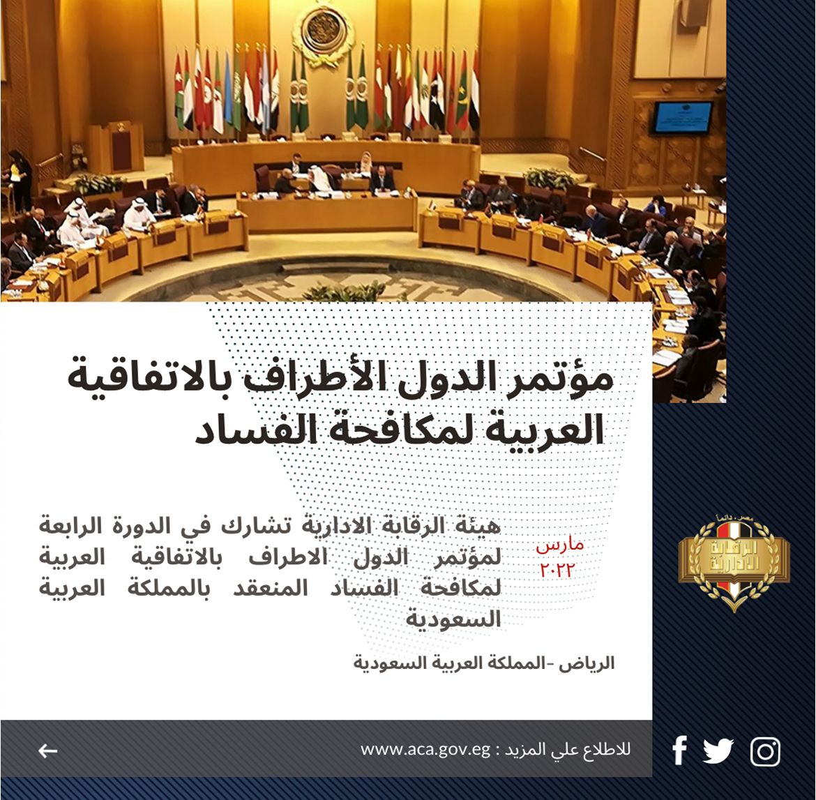 وأشارت الرقابة الإدارية، إلى أن مصر تشارك، في ضوء انضمامها للاتفاقية العربية لمكافحة الفساد، في الدورة الرابعة لمؤتمر الدول الأطراف في الاتفاقية العربية لمكافحة الفساد، والذي تنظمه هيئة الرقابة ومكافحة الفساد نزاهة، في 23 مارس الجاري بالرياض.