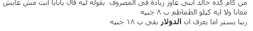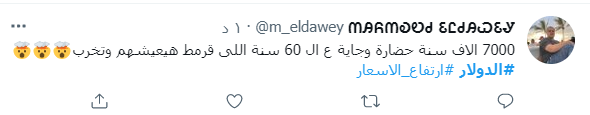 وغرد حساب آخر: بمناسبة أن تويتر كله اتحول لخبراء اقتصاديين وقاعدين يحللوا ارتفاع الدولار وغرق الجنيه، فـ أنا عايز أقول رآيي أنا كمان وأطمنكم يا جماعة بلاش أڤورة، الجنيه ماخسرش غير 15٪ بس من قيمته يعني اللي كان حاله منيل بـ 60 نيلة هيبقى دلوقتي منيل بـ 69 الفرق مش كبير.