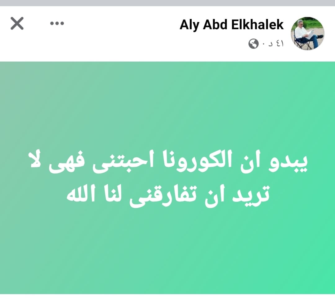 كشف المخرج علي عبد الخالق إصابته بفيروس كورونا للمرة الثانية، حيث نشر على حسابه الشخصي بـ فيس بوك منشورًا كتب في: يبدو أن كورونا أحبتني فهي لا تريد أن تفارقني لنا الله.