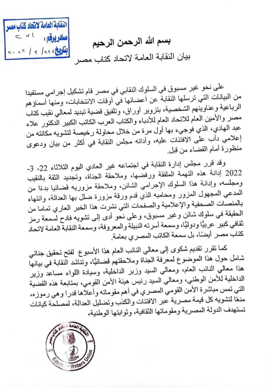 وجاء في البيان: على نحو غير مسبوق في السلوك النقابي في مصر قام تشكيل إجرامي مستفيدا من البيانات التي ترسلها النقابة عن أعضائها في أوقات الانتخابات، ومنها أسماؤهم الرباعية وعناوينهم الشخصية، بتزوير أوراق، وتلفيق قضية تبديد لمعالي نقيب كتاب مصر والأمين العام للاتحاد العام للأدباء والكتاب العرب الكاتب الكبير الدكتور علاء عبد الهادي.