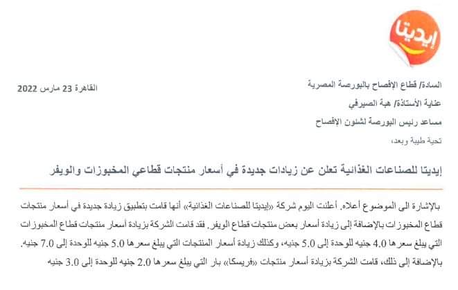 أرسلت شركة إيديتا للصناعات الغذائية، إفصاح للبورصة، اليوم الأربعاء، تعلن من خلاله تطبيق زيادة جديدة في أسعارمنتجات قطاع المخبوزات، بالإضافة إلى زيادة أسعار بعض منتجات قطاع الويفر.