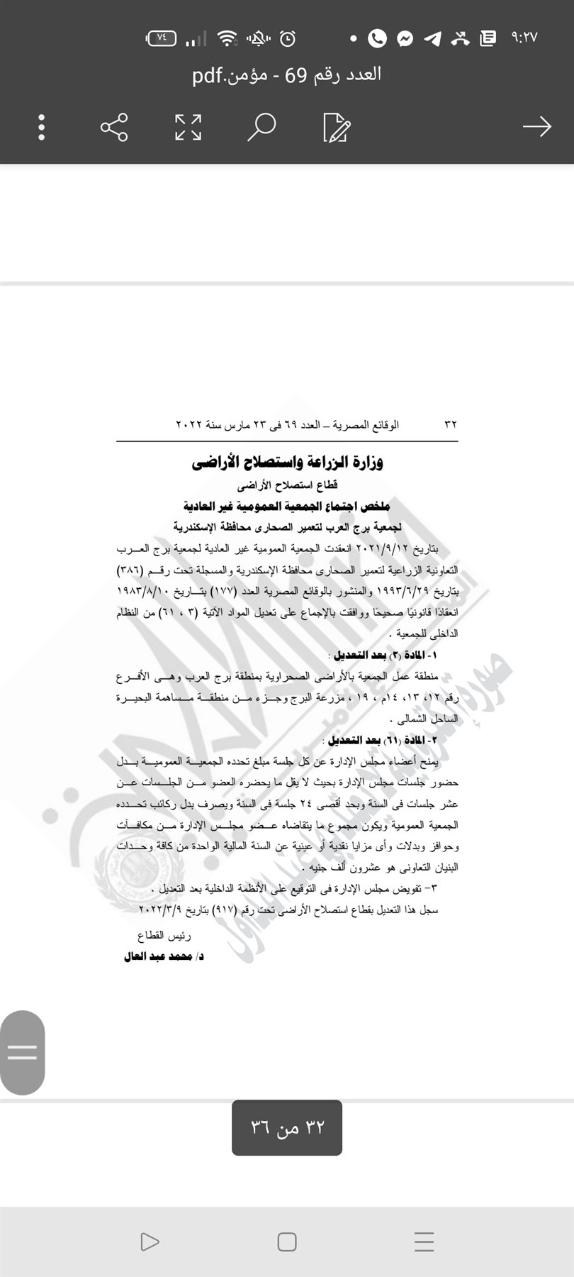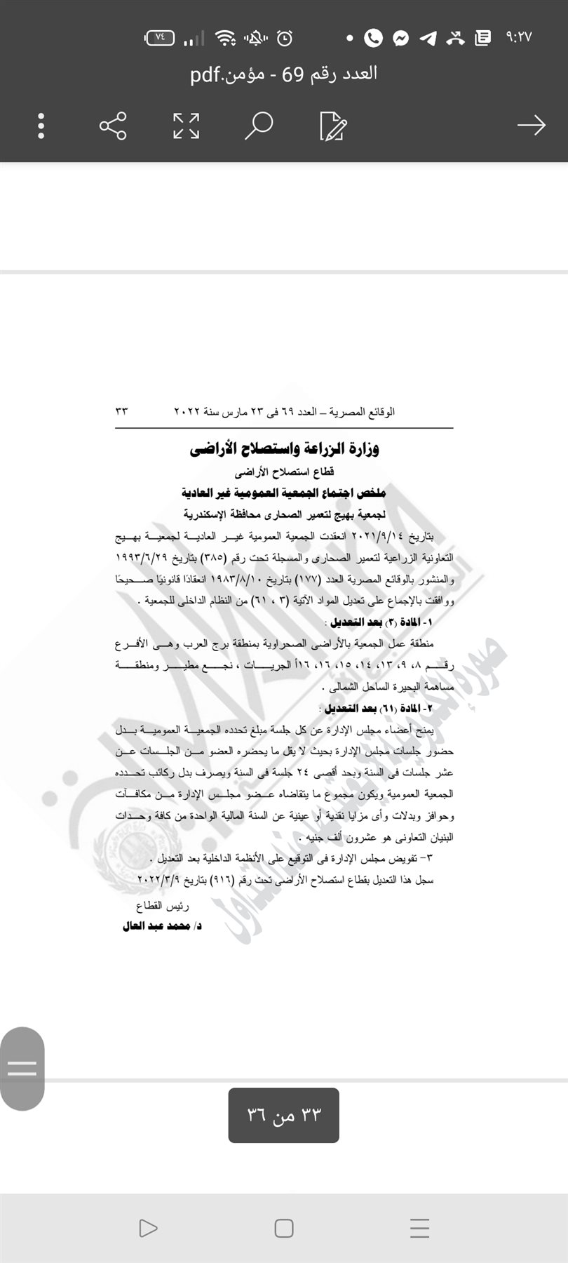 1 - المادة 3 بعد التعديل منطقة عمل الجمعية بالأراضي الصحراوية، ببرج العرب وهي الأفرع صورت.
