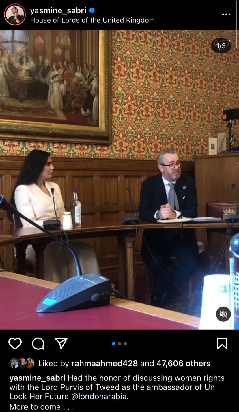 ونشرت ياسمين صبري، الصور عبر حسابها الشخصي بموقع تبادل الصور والفيديوهات القصيرة إنستجرام، معلقة: تشرفت بمناقشة حقوق المرأة، مع اللورد بورفيس تويد كسفير.. المزيد من التقدم قادم.