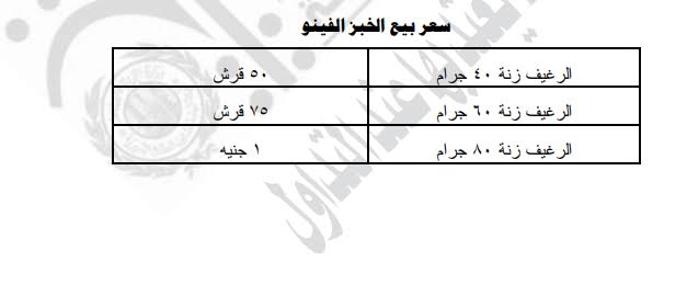 وتكون الأسعار وفق القرار المنشور في الجريدة الرسمية والتى تحدد أسعار الفينو كما يلي، سعر بيع الرغيف زنة 40 جرامًا مبلغ 50 قرشًا، وسعر بيع الرغيف زنة 60 جرامًا مبلغ 75 قرشًا، وسعر بيع الرغيف زنة 80 جرامًا مبلغ جنيهًا واحدًا.