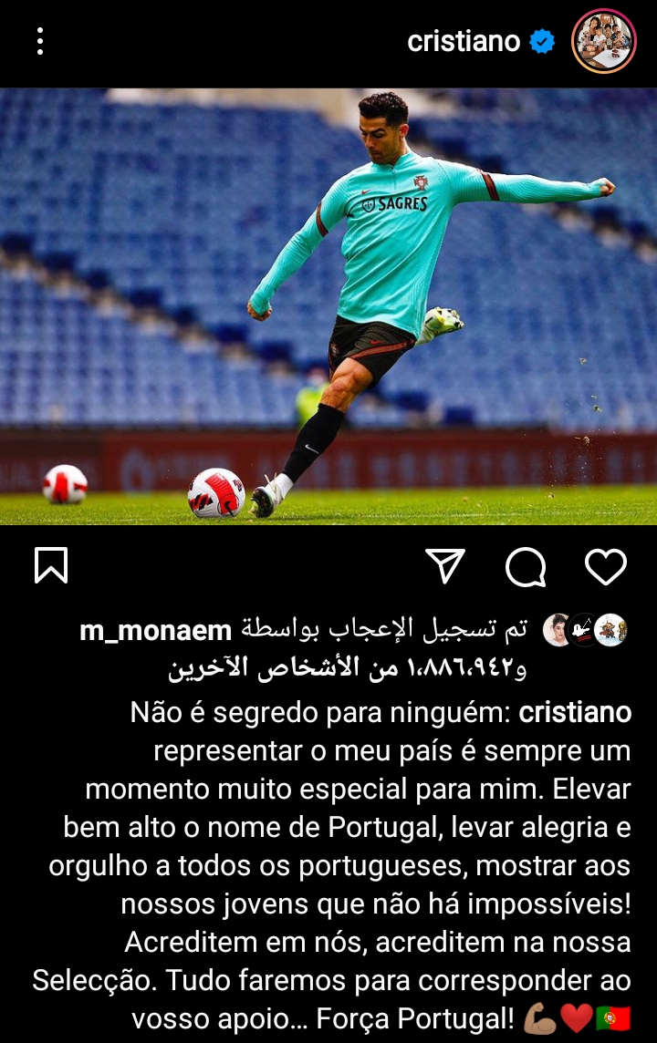 وقال كريستيانو رونالدو عبر حسابه بـ انستجرام: هذا ليس سرًّا لأي شخص، تمثيل بلدي هو دائمًا لحظة خاصة بالنسبة لي، ارفعوا اسم البرتغال عاليًا جدًا، واجلبوا الفرح والفخر لجميع البرتغاليين، وأظهروا لـ شبابنا أن لا شيء مستحيل، وأؤمن بنا، واؤمن بـ اختياراتنا، سنفعل كل شيء لنكون عند حسن ظنكم.