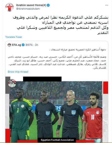 وكتب إبراهيم سعيد على حسابه الشخصي عبر موقع التواصل الاجتماعي “تويتر”: بشكركم على الدعوة الكريمة نظرًا لمرض والدتي وظروف أسرية تمنعني من وجودي في المباراة، وكل الدعم لمنتخب مصر ولجميع اللاعبين وشكرا على التقدير