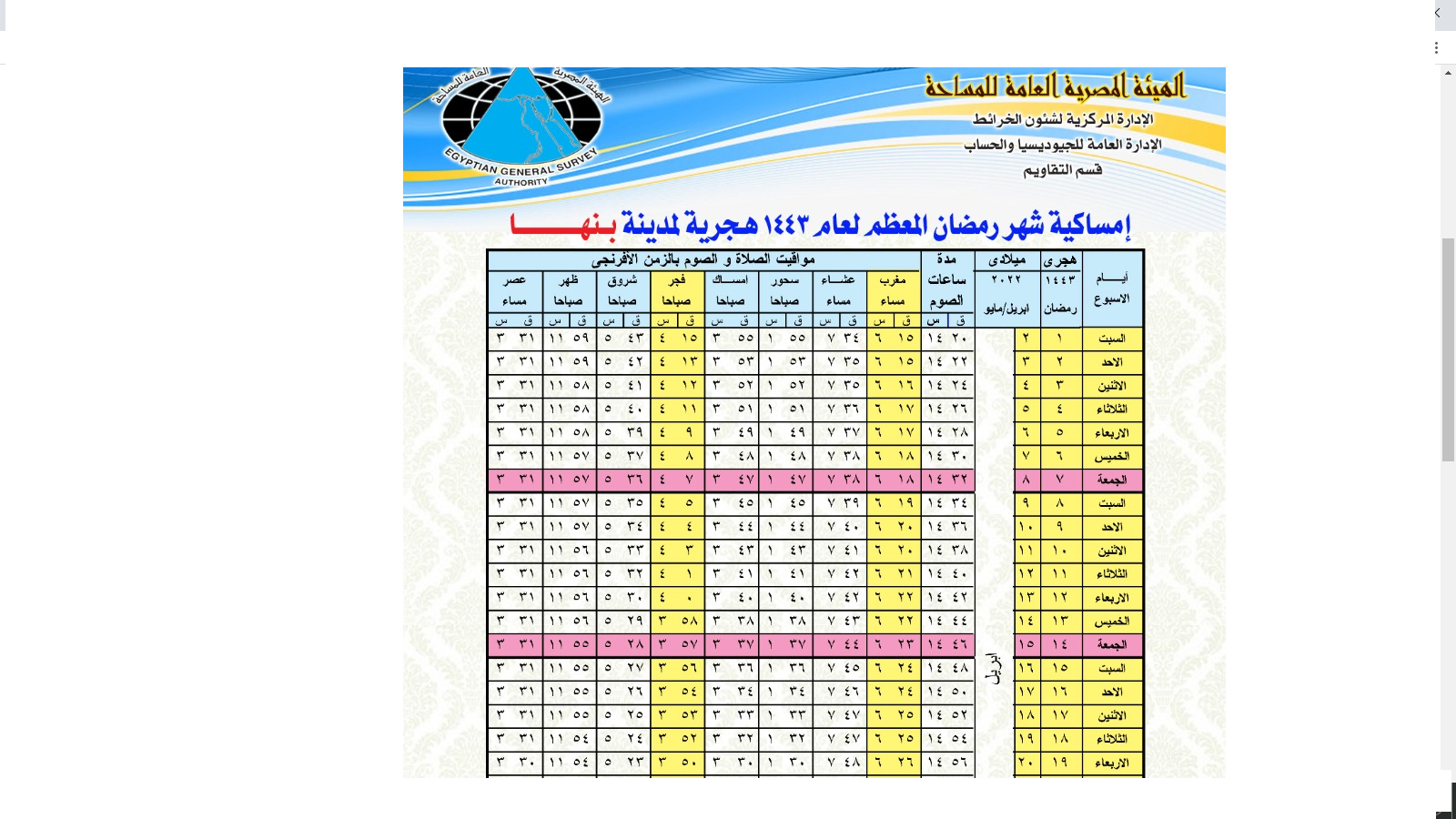 وضعت الهيئة المصرية العامة للمساحة وهي هيئة رسمية حكومية إمساكية رمضان 2022 مصر بالاعتماد على الحسابات الفلكية الدقيقة والمتعلقة بموعد ولادة هلال الأشهر الهجرية في السماء، وخصوصا ولادة هلال شهر رمضان المبارك الذي ينتظره جميع المسلمين حول العالم مع اختلاف رؤيته في كل دولة عن الدولة الأخرى.